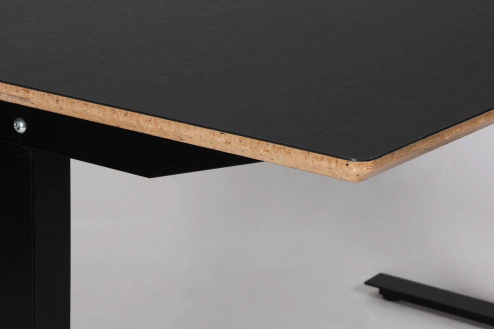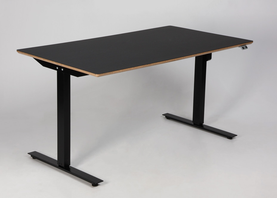 "Hæve sænkebord bestående af en 140 x 80 cm sort linoleumsbordplade med lakeret spånkant og sort 2-leddet stel.