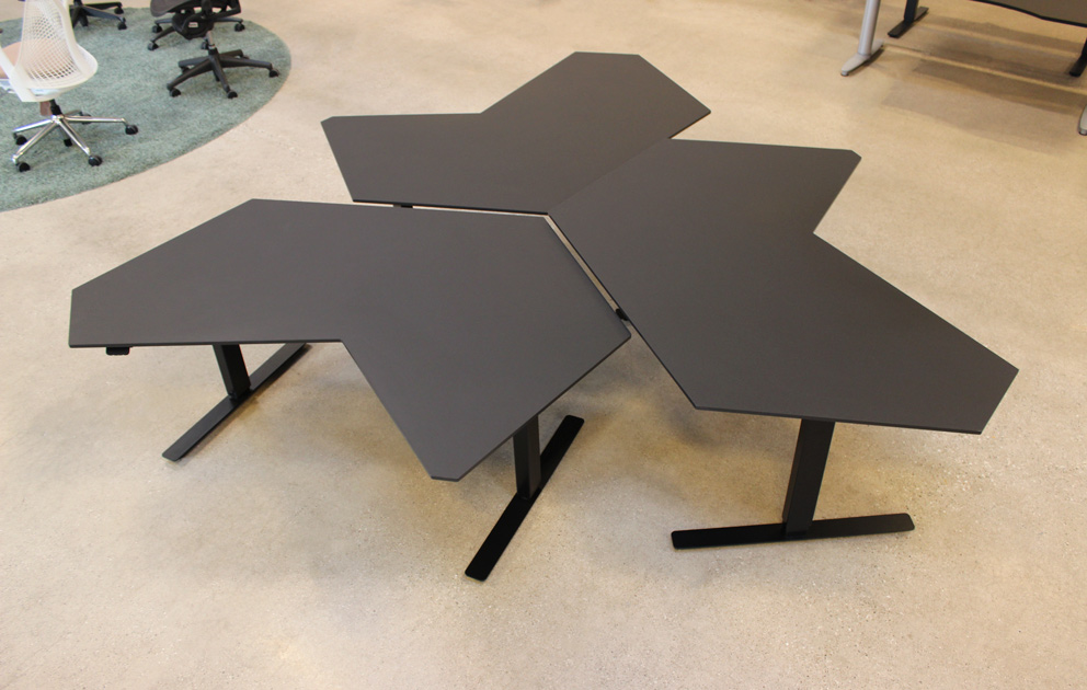 "AiR Compete NDG04 hæve-sænkebords-Ø eller arbejdsstation, bestående af sæt på 3 stk. sorte elektriske hæve-sænkeborde. Bordpladen er udført i FSC-certificeret MDF med en overflade af linoleum. Den unikke udformning gør det muligt at indrette bordopstillingen på flere forskellige måder, så det passer til ethvert lokale. Tilvælg evt. kabelbakke, PowerDots eller andet funktionelt tilbehør – vi monterer det gratis.