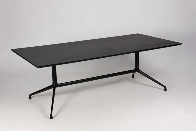 "HAY AAT10 – About a Table konferencebord er et elegant og funktionelt bord designet af Hee Welling. Bordet har en rektangulær bordplade i sort linoleum med afrundede kanter, som giver et eksklusivt og roligt udtryk. Det sorte, pulverlakerede aluminiumsstel skaber et let og moderne look samtidig med, at konstruktionen er stabil og robust. Med sin størrelse er bordet velegnet som konference- eller mødebord til op til 8 personer og passer perfekt ind i både kontormiljøer.