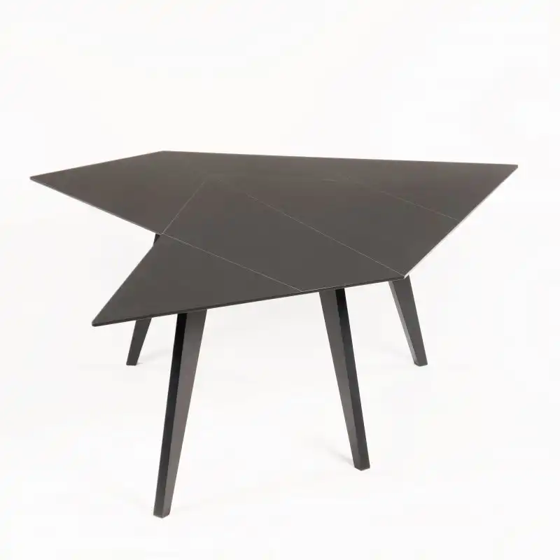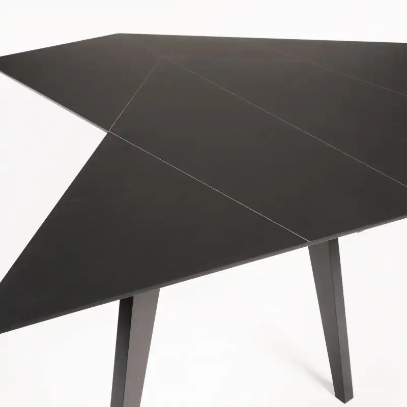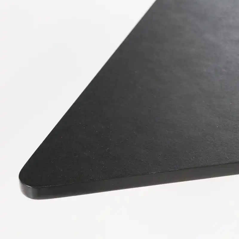 Sort bordplade i MDF med linoleumsoverflade, opdelt i seks felter, med fem skrå sortmalede træben. Bordet er designet så det kan sammensættes flere sammen – ideelt er to borde sammen. Alt efter stolebredde, passer bordet til 7-8 personer.