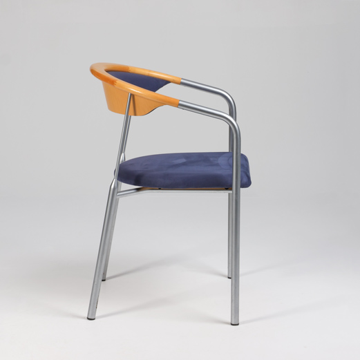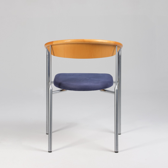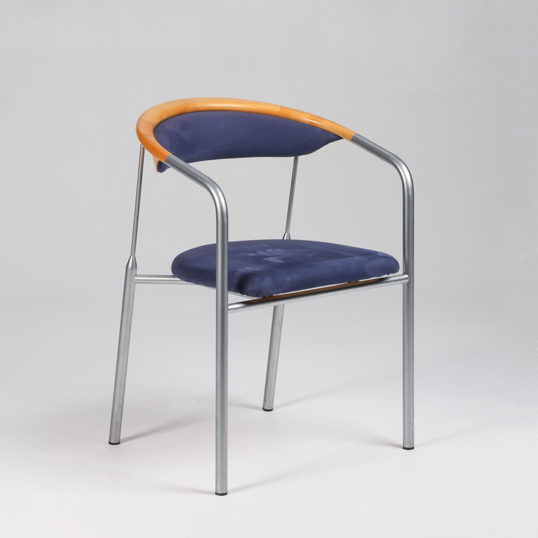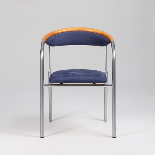 "Henrik Tengler Chairman konference- og mødestol i blå alcantara, rygstykke i birk samt stel i satinbørstet stål.