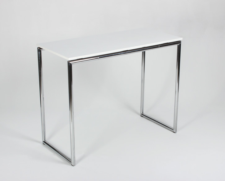 Højbord i hvid laminat med blankforkromet stel. Det runde stel danner en fast og stabil ramme og giver et eksklusivt udtryk, som det flugter bordkanten. Laminatbordpladen har en rengøringsvenlig overflade, der gør det ideelt til brug i spiseområder som kantine eller loungeområde. Bordets højde passer til barstole med en sædehøjde på ca. 71-84 cm. Se eventuelt vores udvalg af brugte barstole.