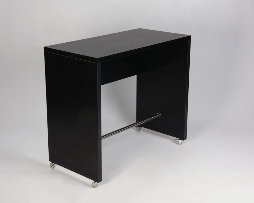 Højbord i sortbejdset træ med låsbare hjul og fodhviler i børstet stål. Ideelt eksempelvis til lounge eller som afsætningsbord i kantinen.