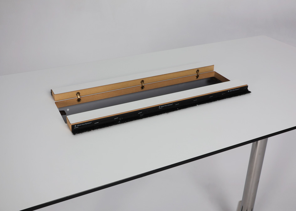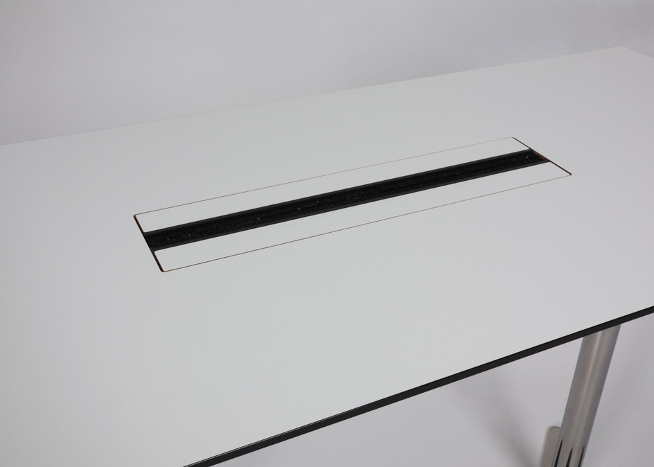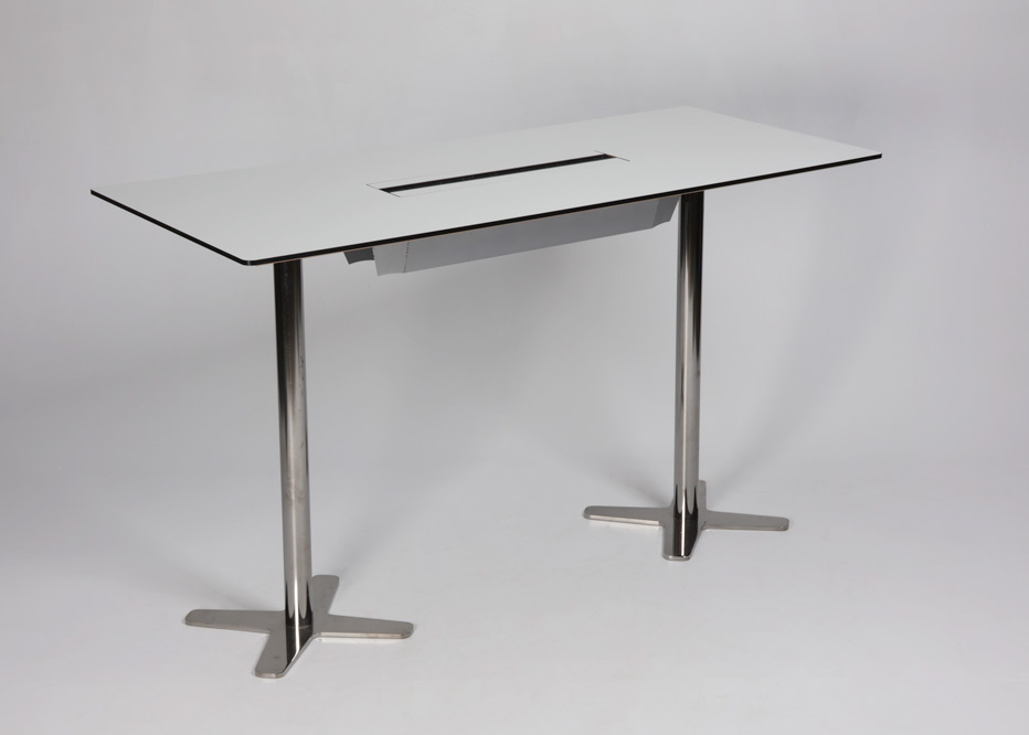 Højbord / mødebord i hvid laminat med sort affaset kant og to blankforkromede sokler. Smalt bord i rengøringsvenlige materialer, til uformelle mødelokaliteter, hvor strømforsyning kan gemmes af vejen i kabellemmen.