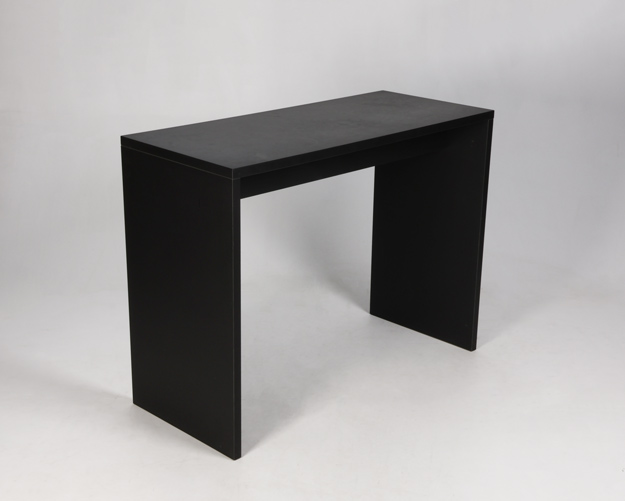Højbord med plads til to personer på hver side, i sort linoleum med lige kanter.