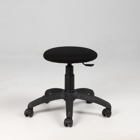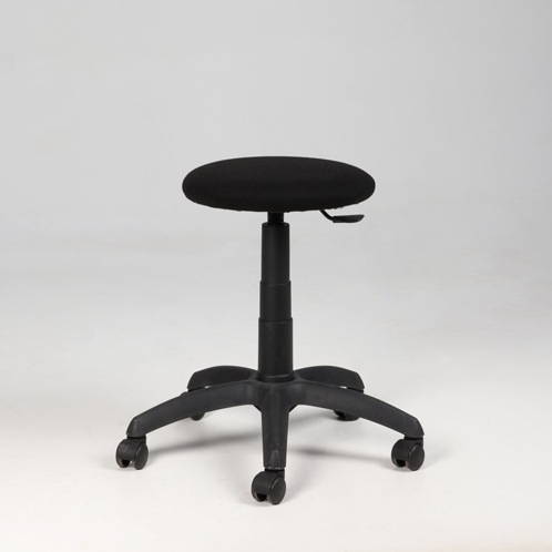 "Højdejusterbar stol på hjul med polstret sort sæde betrukket med fame.