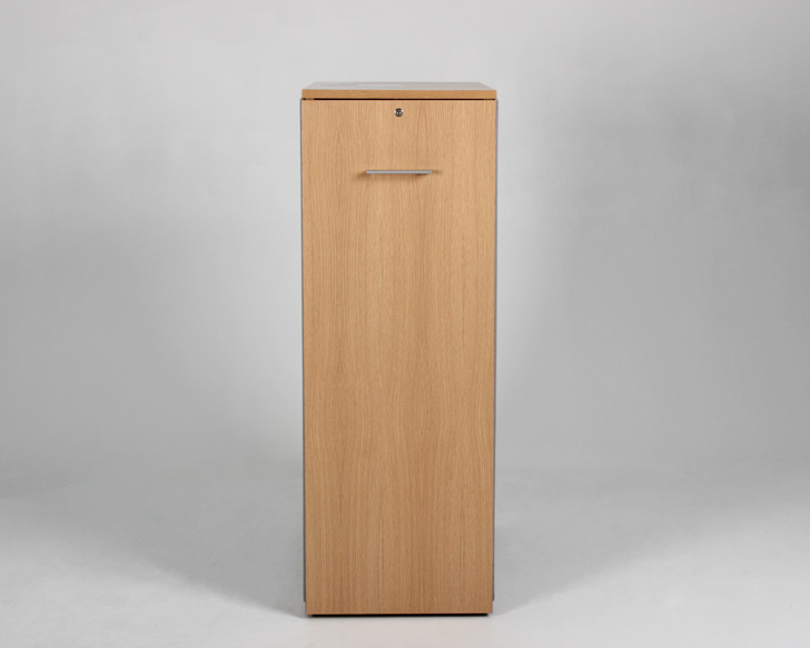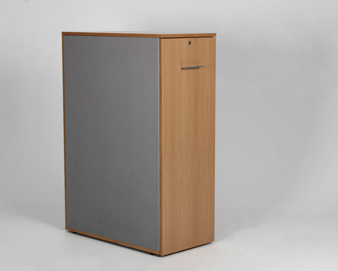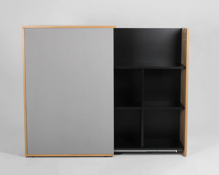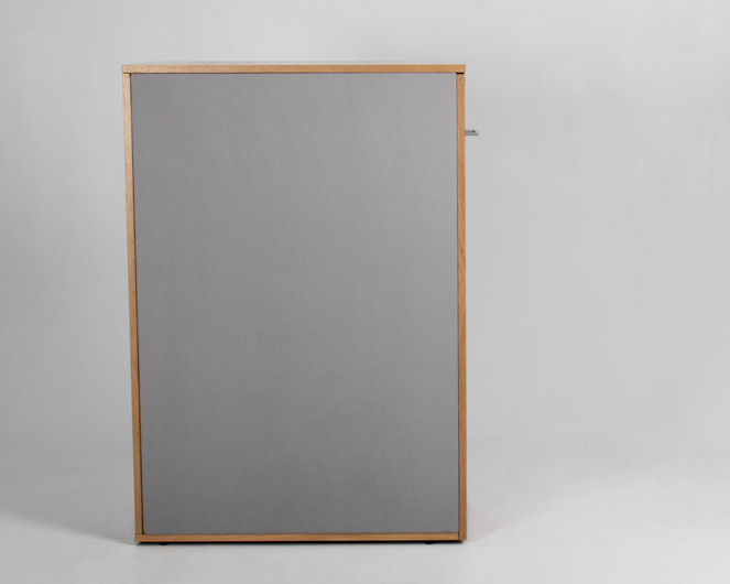 "Højrevendt udtræksskab i egefiner og sort laminat indvendigt. Begge sider er beklædt med tekstil-typen xtreme, og virker både lyddæmpende og som opslagstavle. Skabet har faste hylder med god plads til bl.a. ringbind og øvrige kontorartikler. Smart opbevaringsmøbel der desuden fungerer godt til at adskille og opdele arbejdsstationer – eksempelvis i åbne kontorlandskaber.