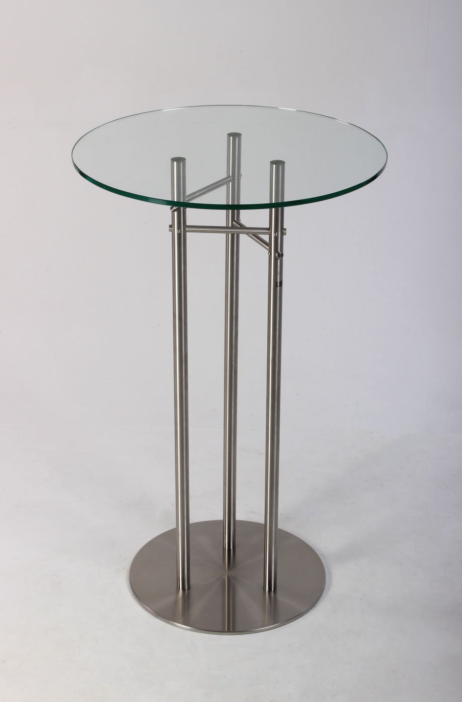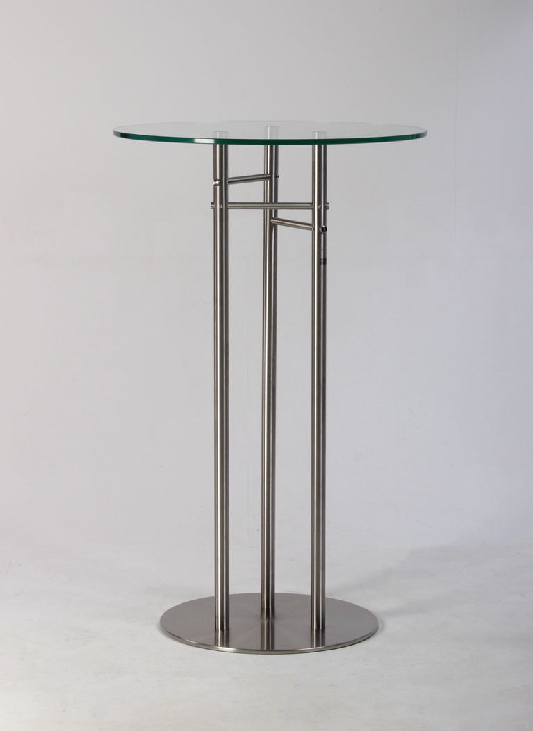 Rosconi højt cafébord med bordplade i glas og trebenet stel i børstet stål.