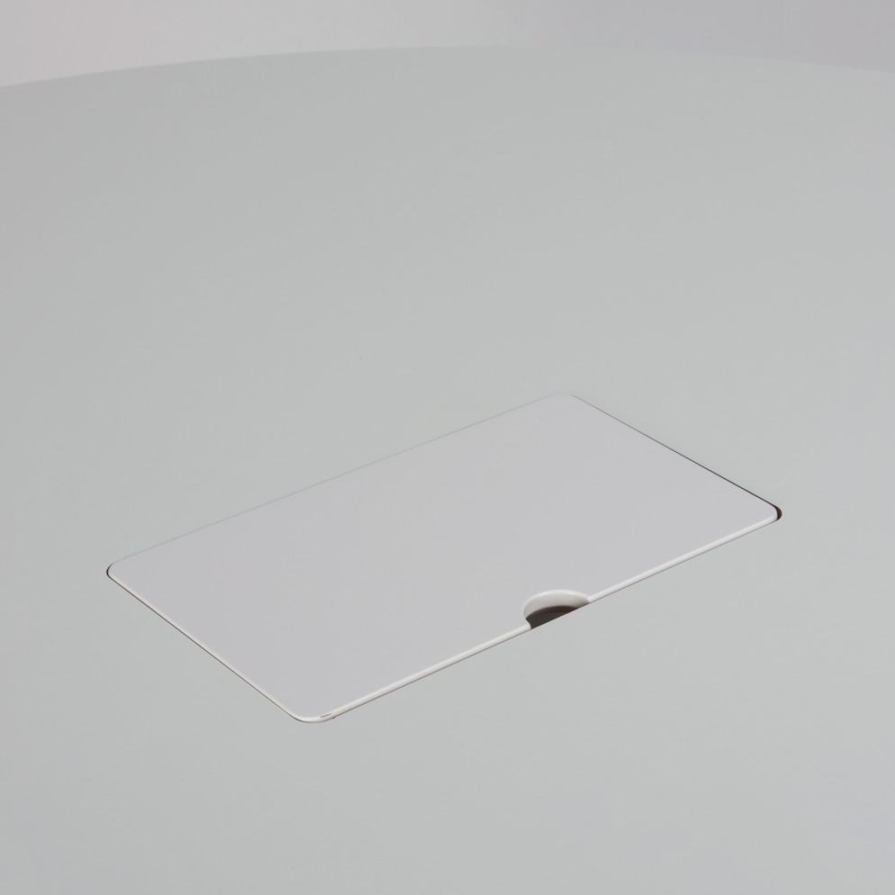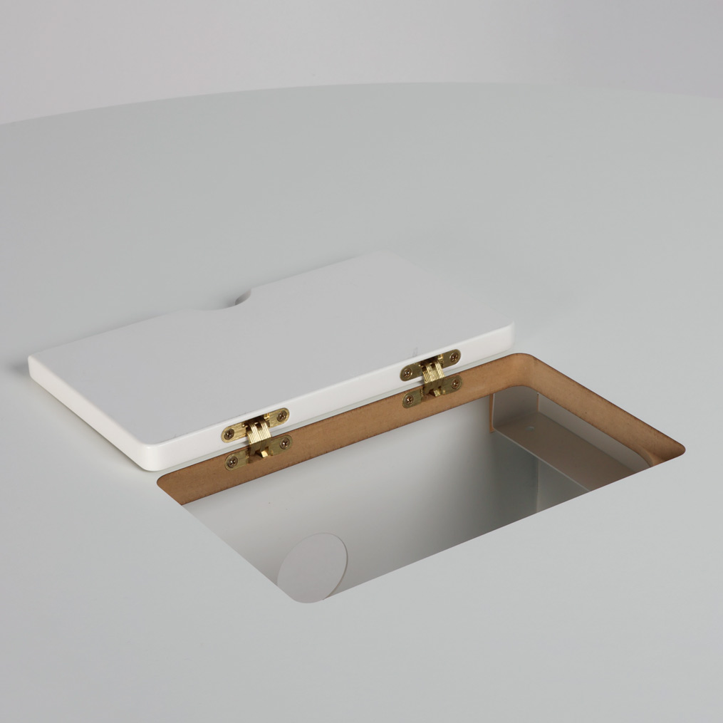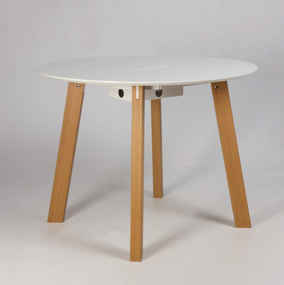Kombineret møde- og højt cafébord med rund hvid laminatbordplade og egetræsstel. Centreret i bordpladen er en kabellem med opbevaring til fx. strømforsyning, mindre kontorartikler eller lignende nyttigt til brug i virksomhedens uformelle område. Bordhøjden passer til barstole der har en sædehøjde på ca. 60-68 cm.