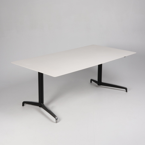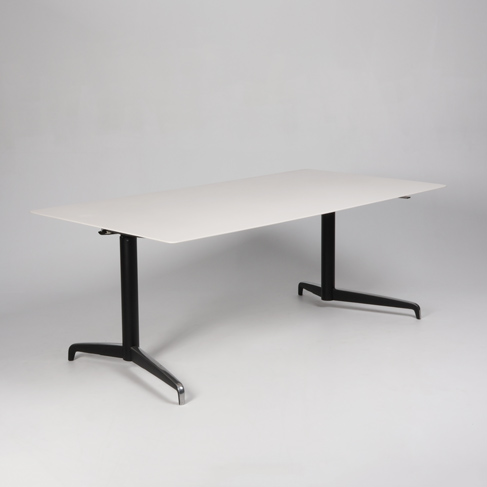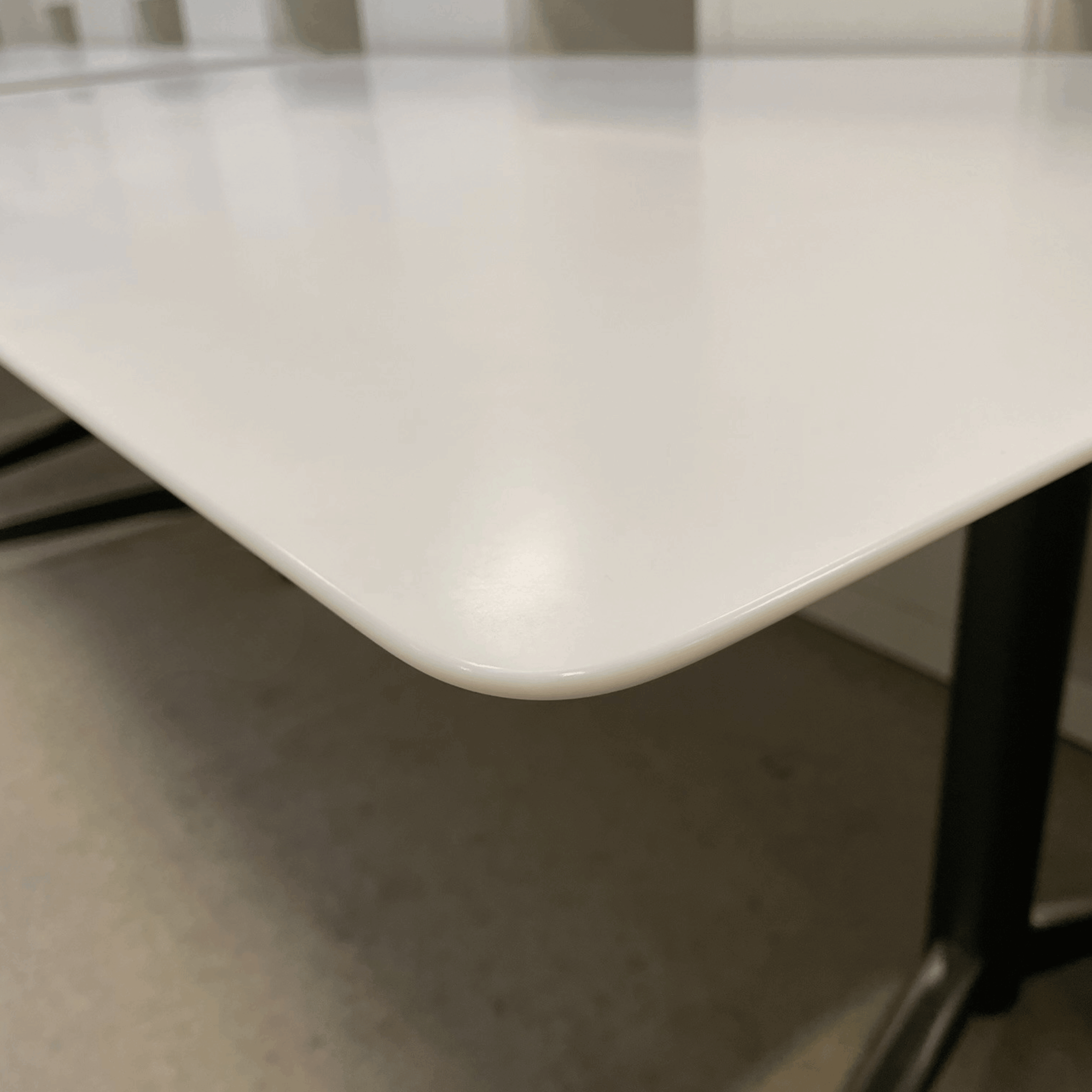 "Holmris Genese hæve sænkebord med bordplade i hvid helstøbt plast med afrundede kanter og kabelbakke.