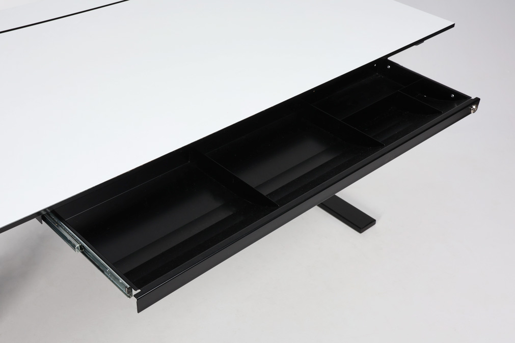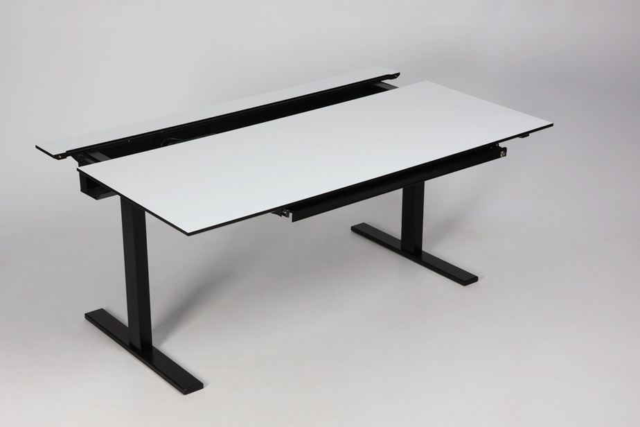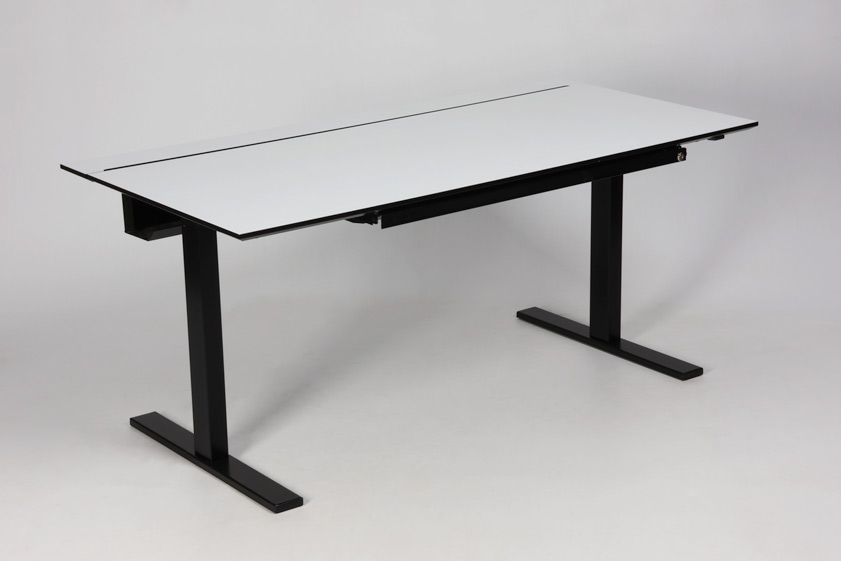 "Holmris elektrisk hæve-sænkebord i hvid laminat med sort kant. Elegant og funktionelt skrivebord med elektrisk højdejustering. Bordpladen i hvid laminat med sort kant, har en smart skydefunktion, der giver adgang til skjult kabelopbevaring. Bordet er udstyret med en bred udtræksskuffe, dog kan nøgle ikke garanteres medfølgende. Ideelt valg til et stilrent og ergonomisk arbejdsmiljø.