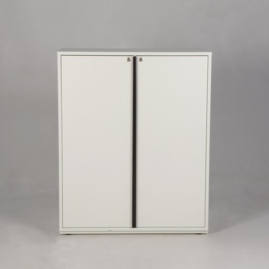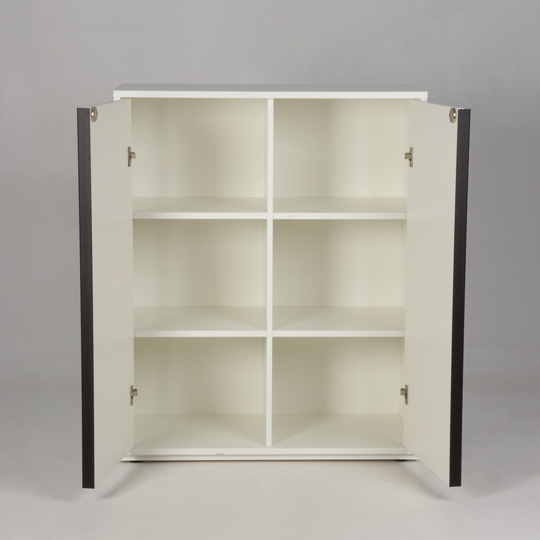 Skabet har seks rum med faste hylder og har god plads til blandt andet ringbind, brevbakker og andre kontorartikler.