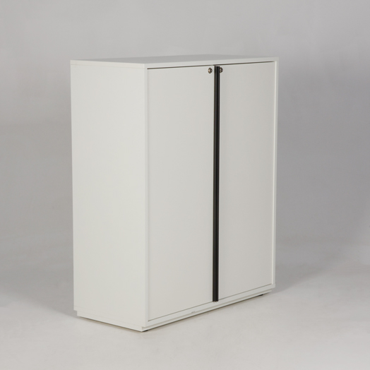"Holmris skab på sokkel i hvid laminat med soft close-lukning og sorte aluminiumsgreb.