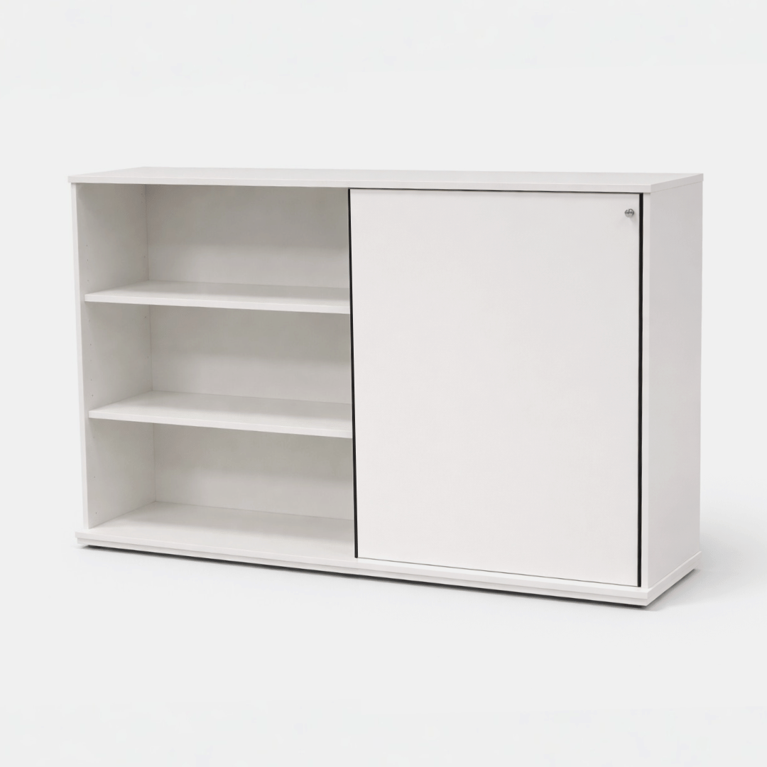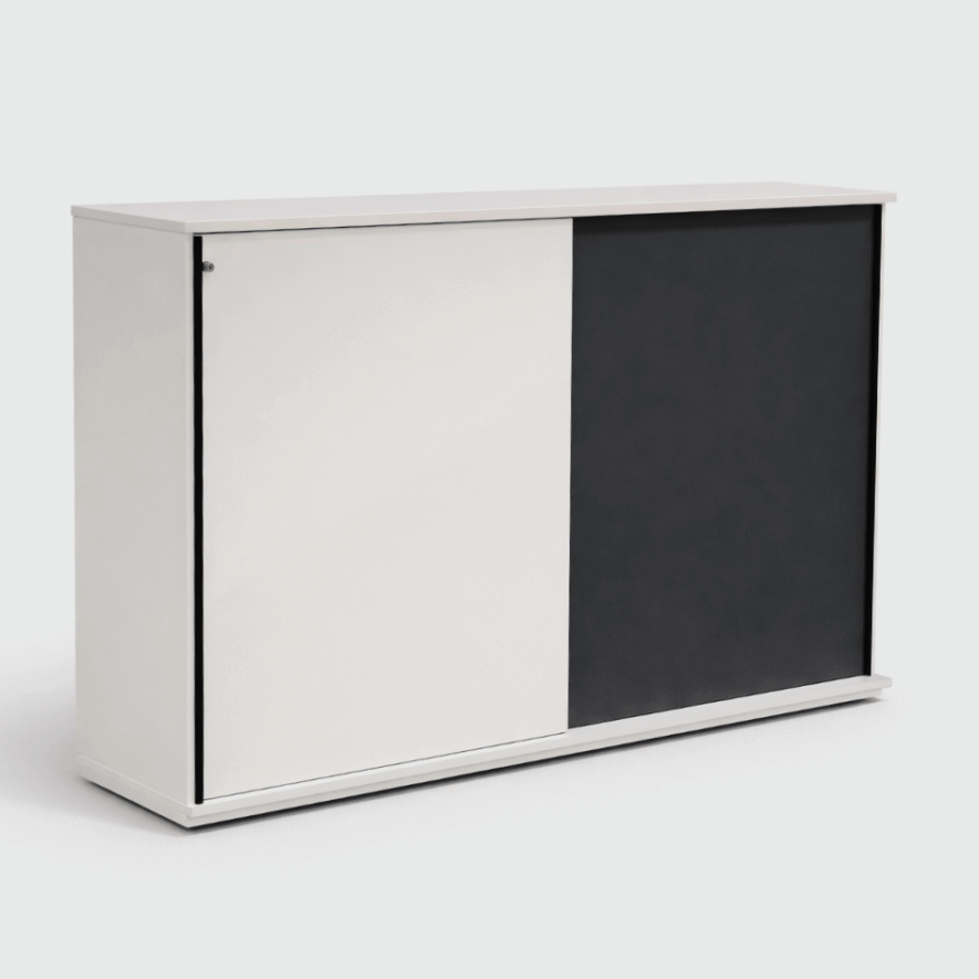 "Holmris kontorskab med korpus i hvid laminat, to skydelåger – den ene i antracitgrå og den anden i hvid. Lågerne aflukkes med sorte vertikale aluminiumsgreb.