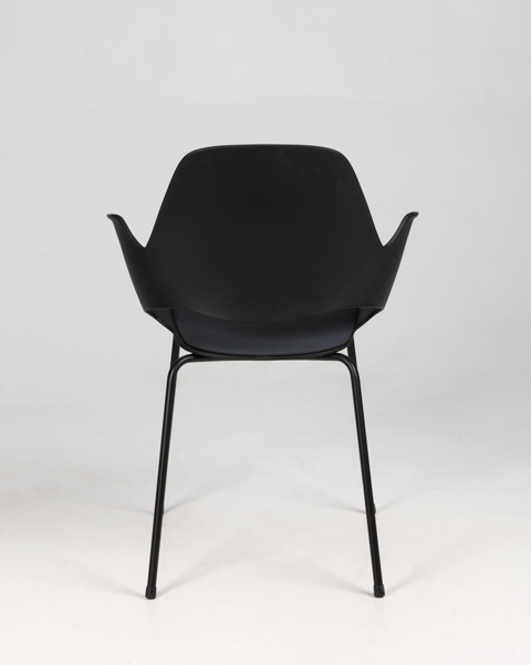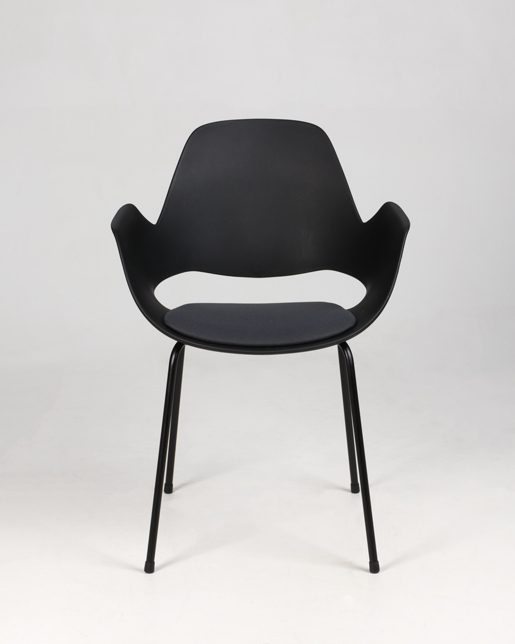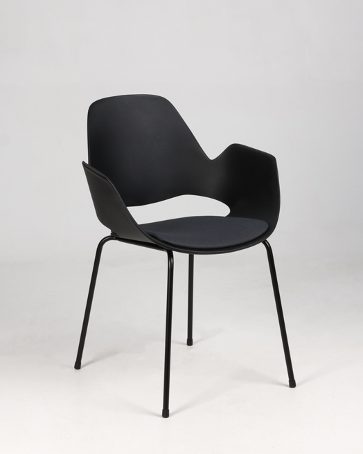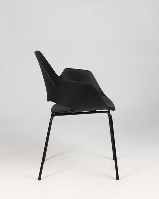 "Stabelbar mødestol i sort plast med sædepolstring i mørkegrå Cura.