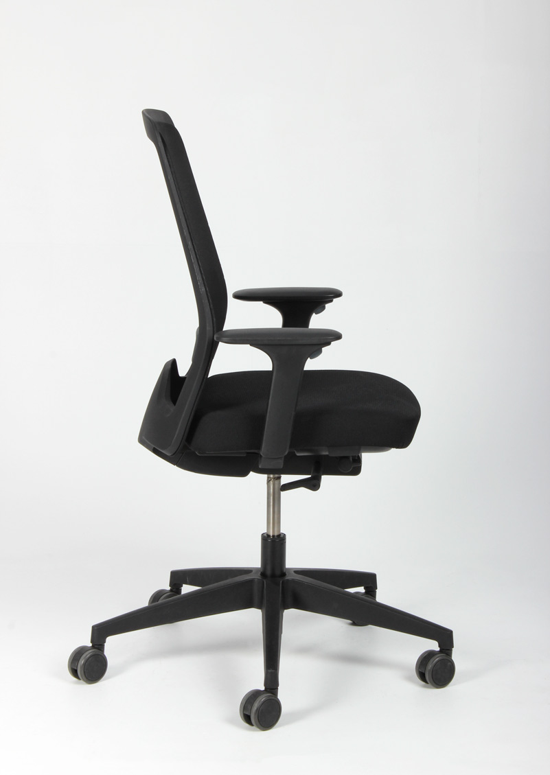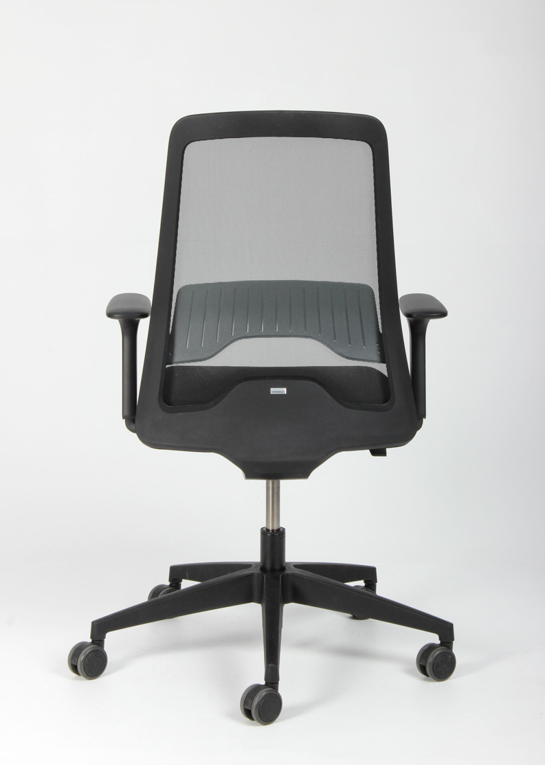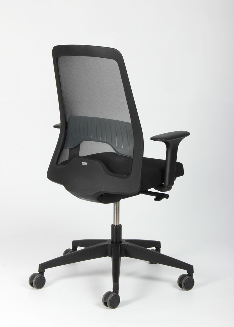 "Interstuhl Every 251 kontorstol i sort med mesh ryg, justerbar lændestøtte samt justerbare armlæn. Sort fodkryds med gummibanehjul, som er særdeles velegnet til hårde underlag som f.eks. trægulve og lignende.