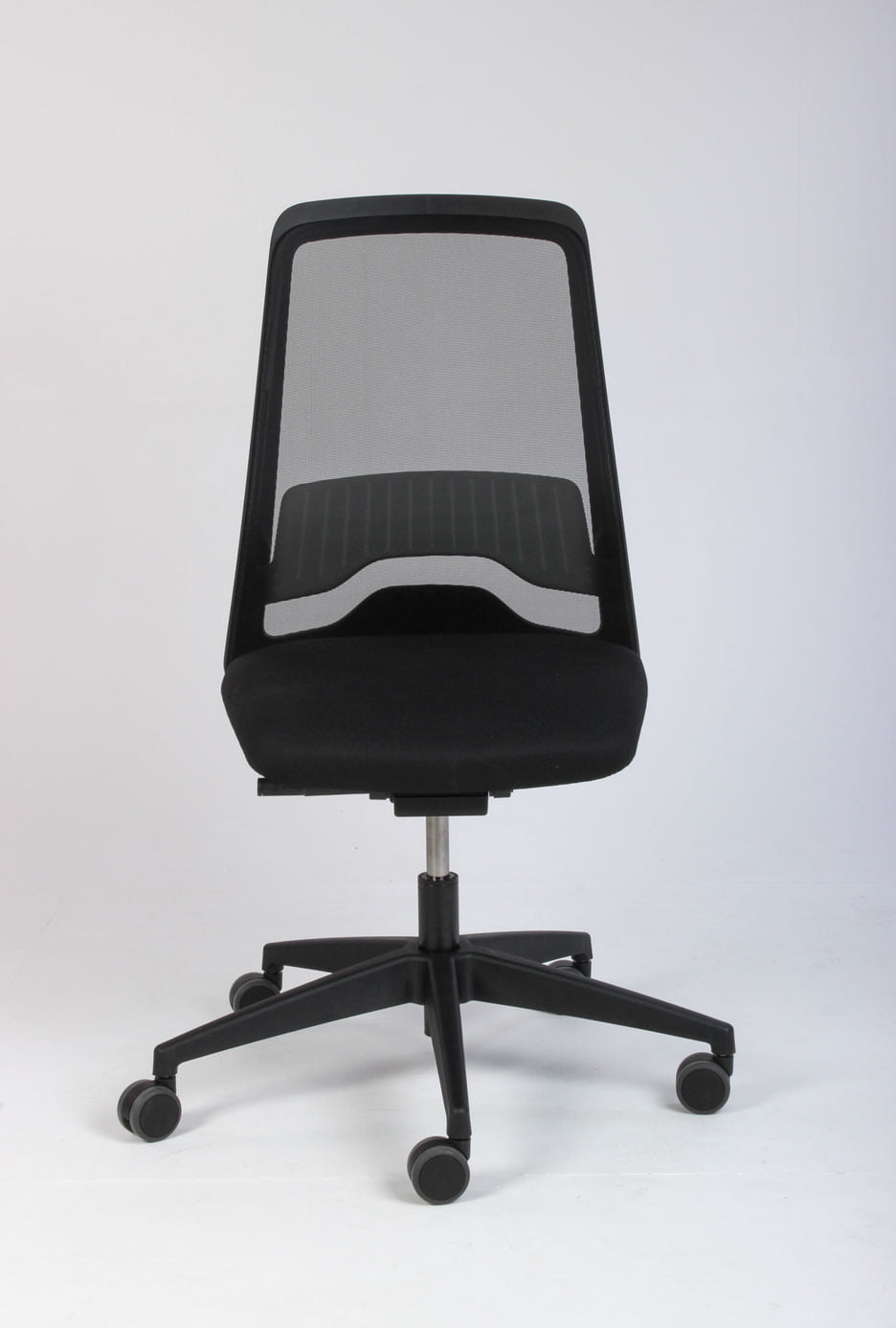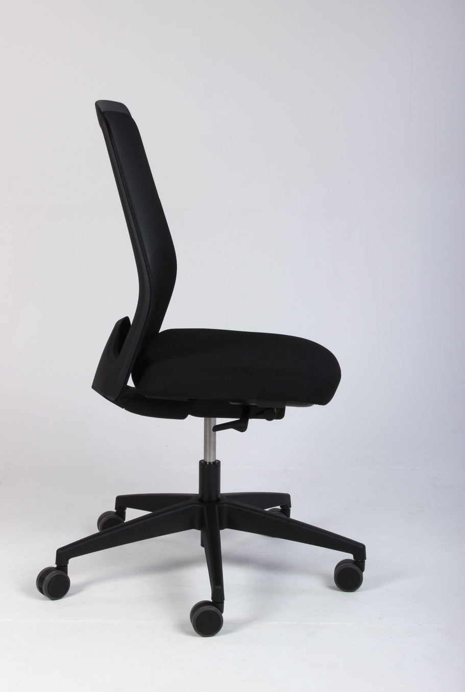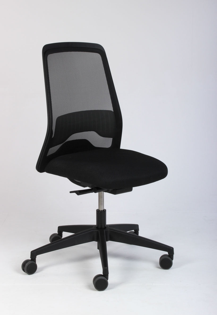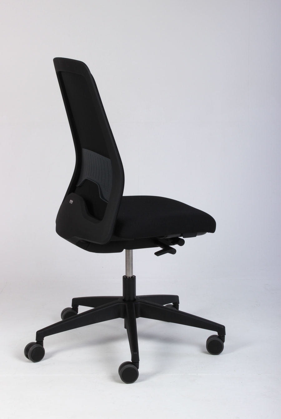 Interstuhl Every kontorstol med ryglæn i sort mesh og sort polstret sæde. Interstuhls synkronmekanik tilpasser ryglænets modtryk præcist til brugeren og støtter kroppen optimalt i alle positioner.