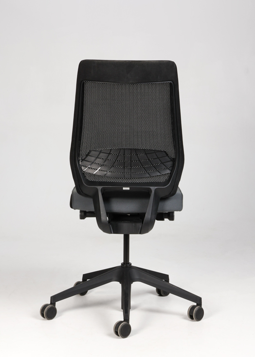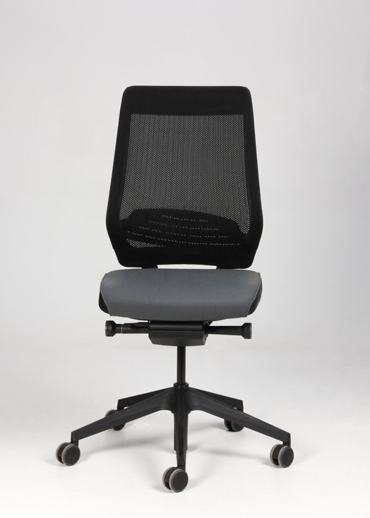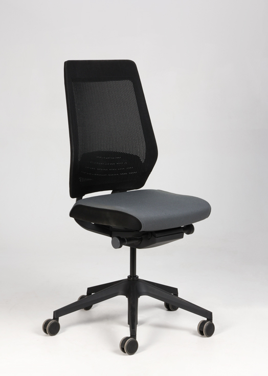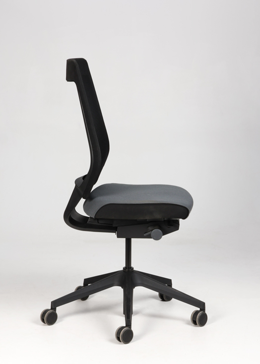 "Interstuhl kontorstol med ryglæn i sort mesh og gråt polstret sæde i fame. Foruden at kunne justeres i højden, har kontorstolen sædedybderegulering samt justerbar lændestøtte, så den kan tilpasses brugerens individuelle behov for komfort, dagen i gennem.