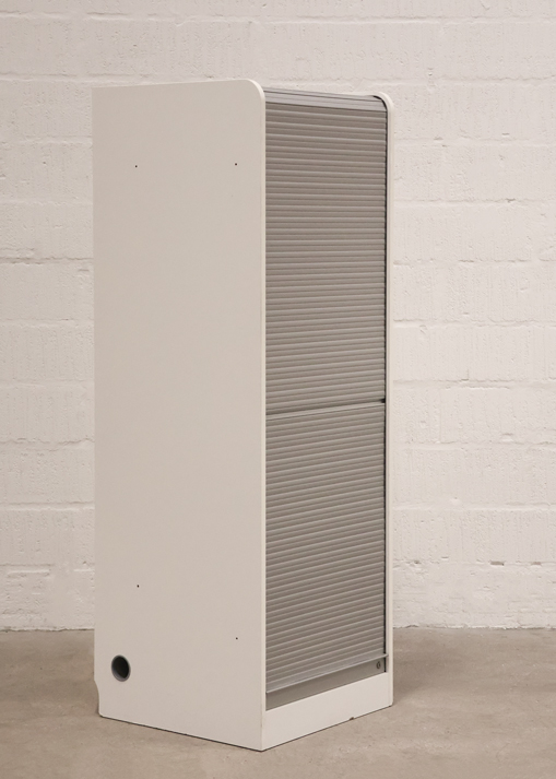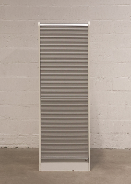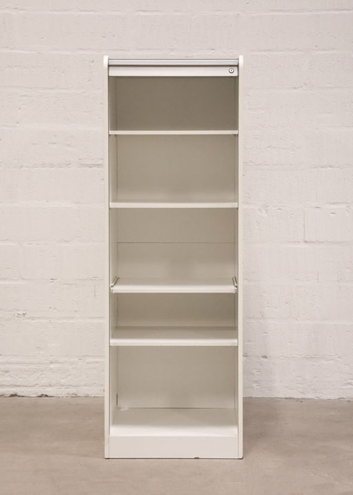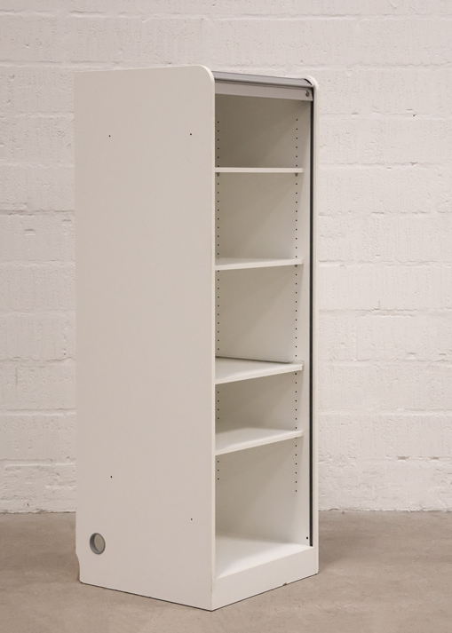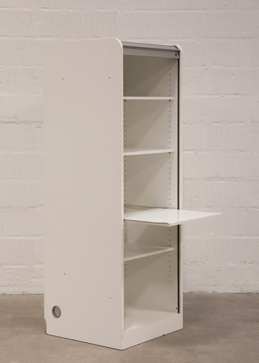 "Højt jalousiskab i hvid med udtrækshylde. Skabet består af 5 rum, så der nemt og overskueligt kan opbevares kontorartikler mm.
