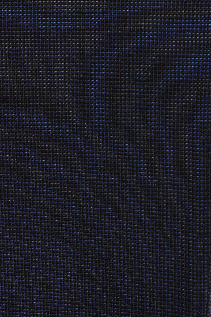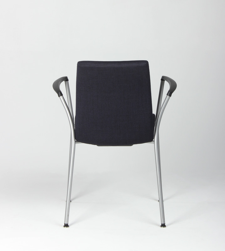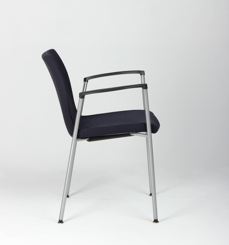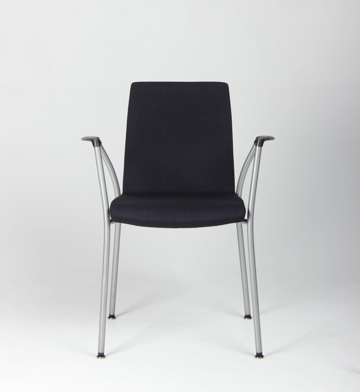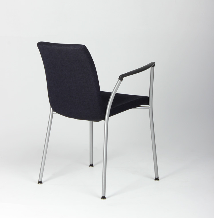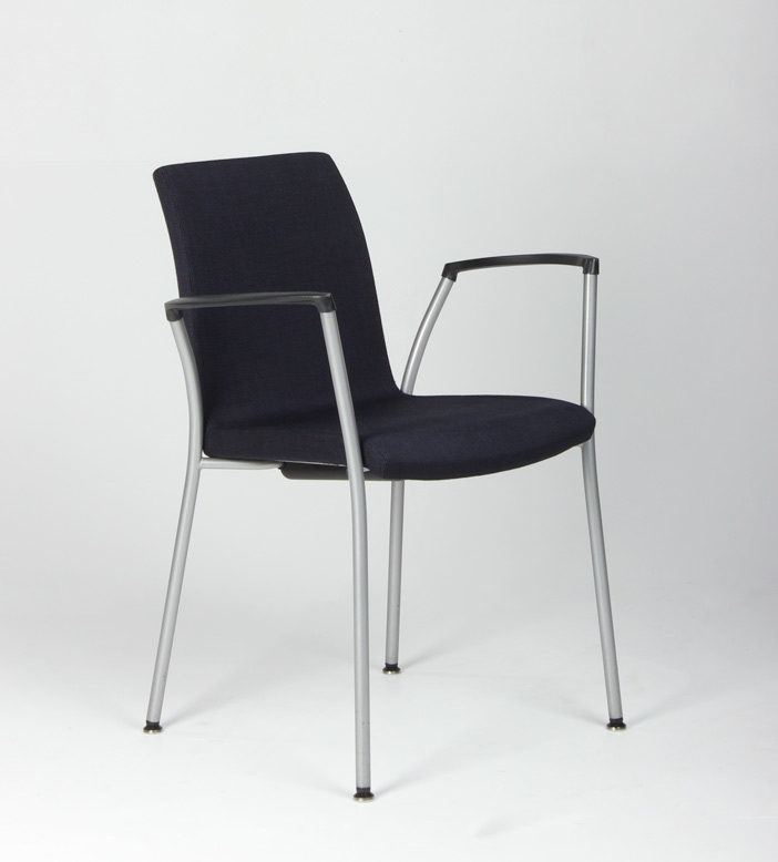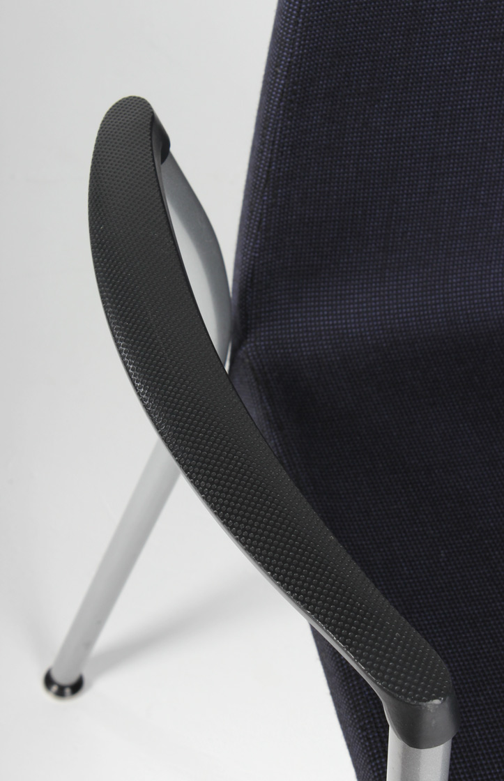 "Akaba Design model Gorka konferencestol med armlæn, polstret i sæde og ryg med mørkeblå mønstret fame. Stolen har gråt stel og kan stables.