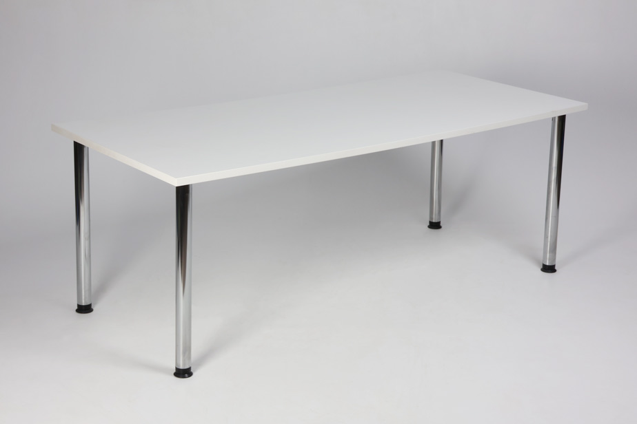 "Kantinebord i hvid laminat med hvid ABS kant og blankforkromet stel.
