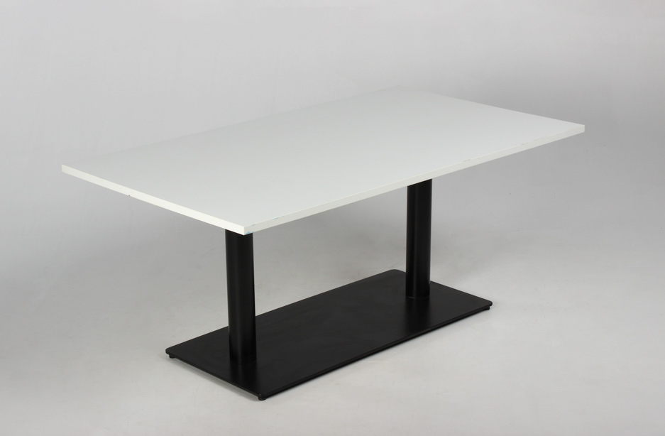 "Gedigent og praktisk lavt bord med hvid laminatbordplade på sort dobbeltsokkel.