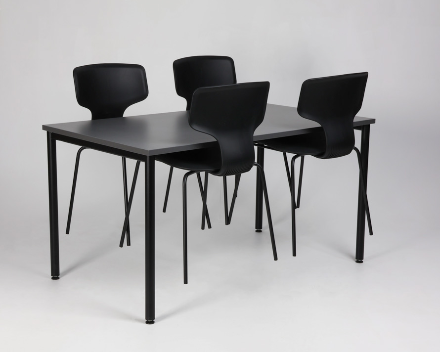 "Kantinesæt til 4 personer i sort og antracitgrå, i et enkelt design af rengøringsvenlige materialer.