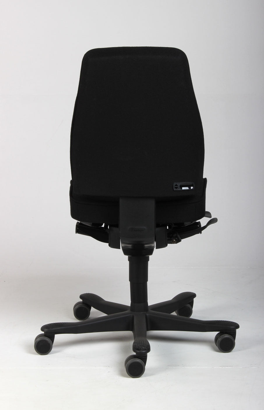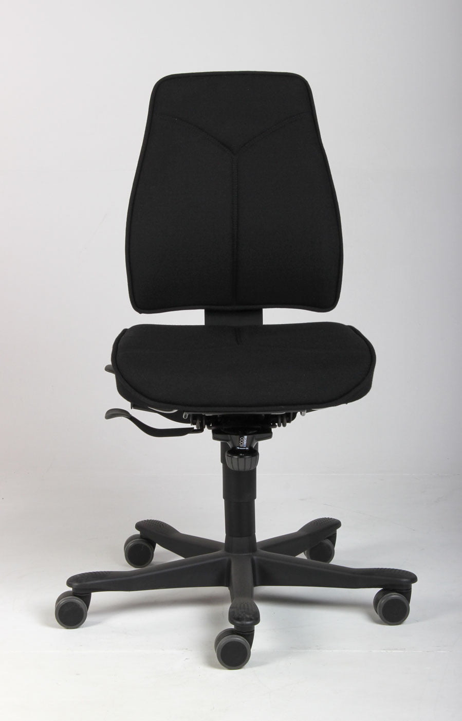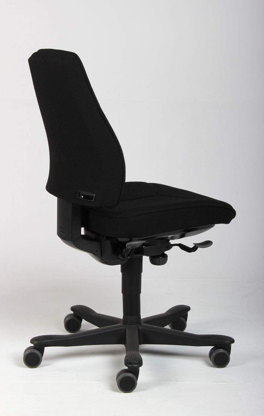 "Kinnarps Free Float 6230 kontorstol i sort fame med kanalsyninger. Stolen har Free Float-vippemekanisme med vægtregulering, som gør at den kan indstilles til langt de fleste mennesker. Sædedybde og højde på ryglænet kan ligeledes indstilles individuelt.