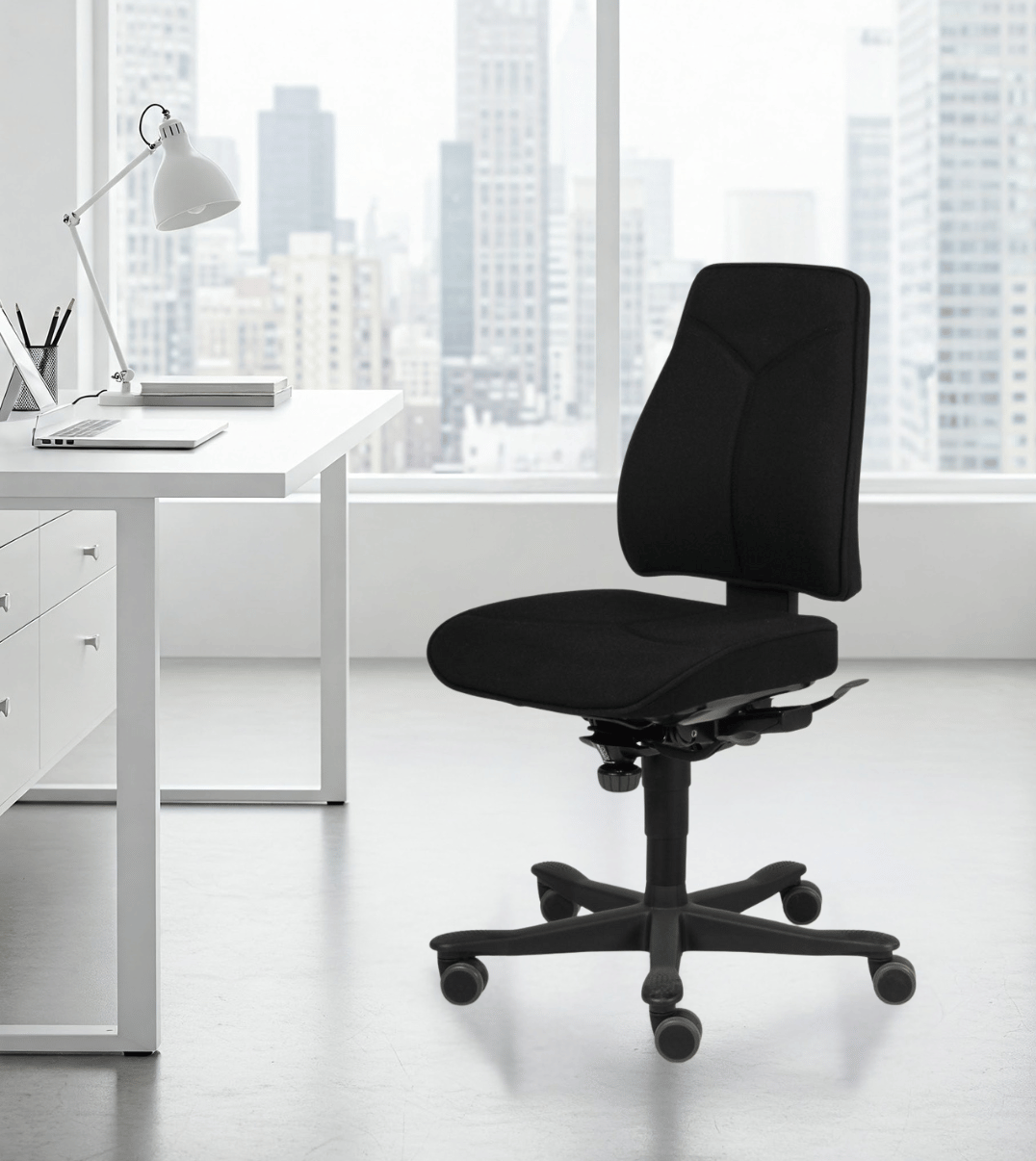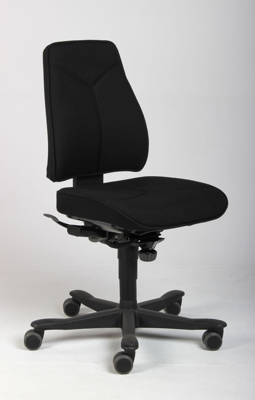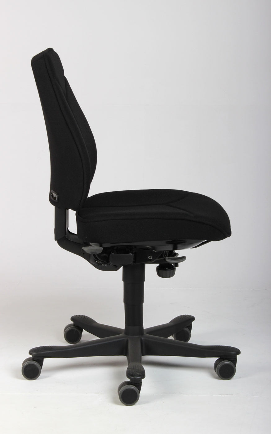 "Kinnarps Free Float 6230 kontorstol i sort fame med kanalsyninger. Stolen har Free Float-vippemekanisme med vægtregulering, som gør at den kan indstilles til langt de fleste mennesker. Sædedybde og højde på ryglænet kan ligeledes indstilles individuelt.