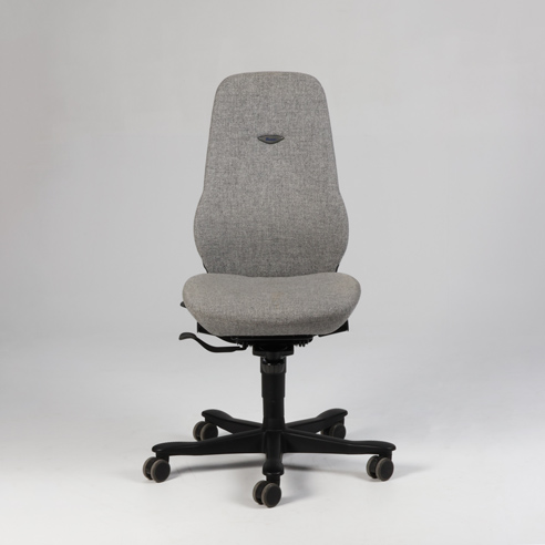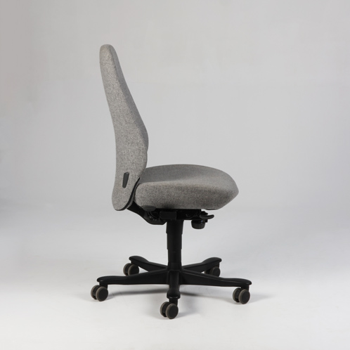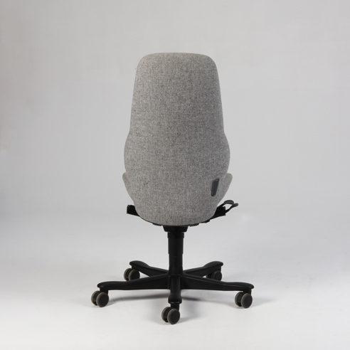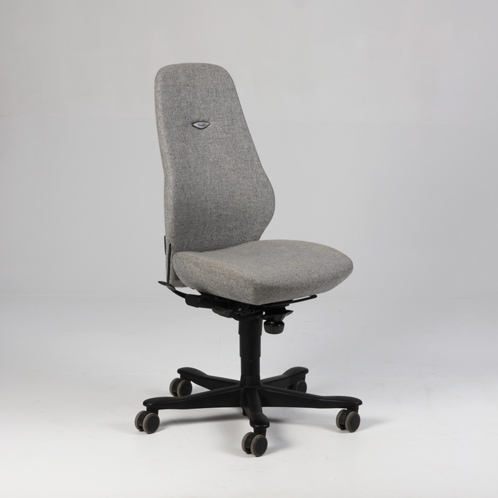 "Kinnarps Free Float 6770 kontorstol, med gråmeleret betræk i groft vævet uld.