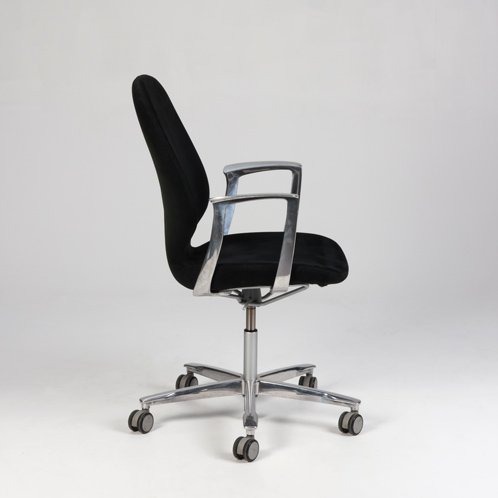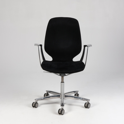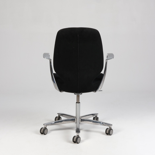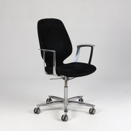 Fuldpostret og betrukket med sort alcantara og fodkryds i grå og poleret stål med fem hjul.