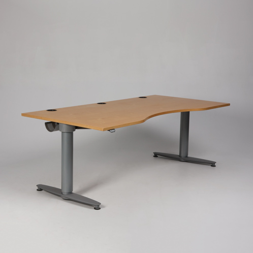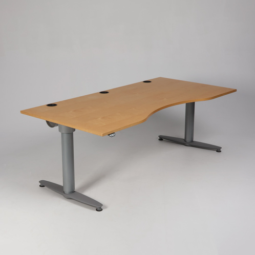 "Populært kvalitetshæve-sænkebord fra anerkendte Kinnarps model Serie (T). Bordplade i birk med centreret mavebue og kabelgennemføringer.