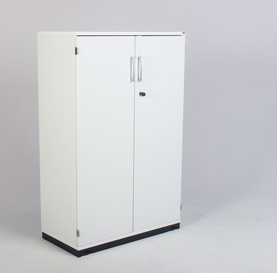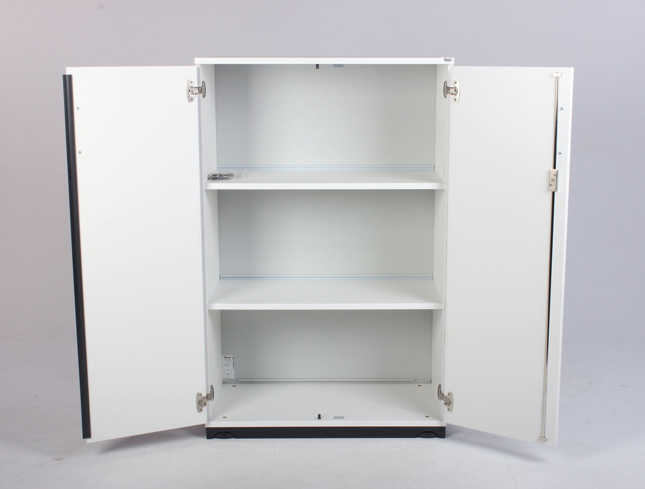 "Kinnarps skab i hvid laminat med mat grå alu-greb. Opbevaringsmodulet rummer god plads til blandt andet ringbind og andre kontorartikler, og kan ved hjælp af stilleskruen i soklen, justeres så den tilpasses et hvert underlag.