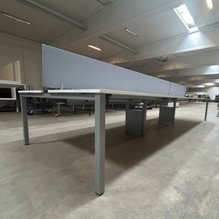 "Kinnarps langt skrive- og arbejdsbord med bordplade i seks dele og afskærmninger i midten. På hver siden af skærmen er der en kabelskinne hvor ledninger kan føres gennem til de indbyggede stik og kabelbakkerne herunder. Bordet har – alt efter stolebredde, plads til 8 personer på hver side og er ideelt til brug på undervisningssteder, biblioteker og lignende.
