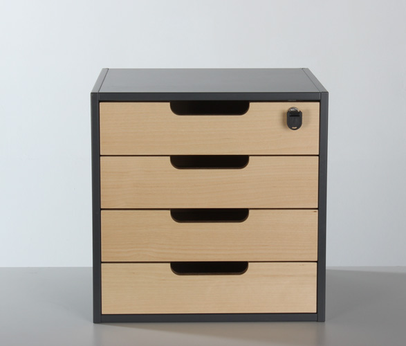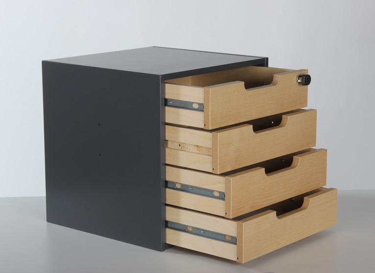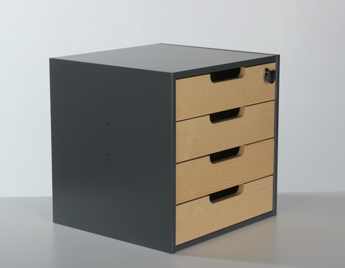 "Skuffeindsats til reol eller skab i lys birk og antracitgrå laminat med fire skuffer og nøgle.