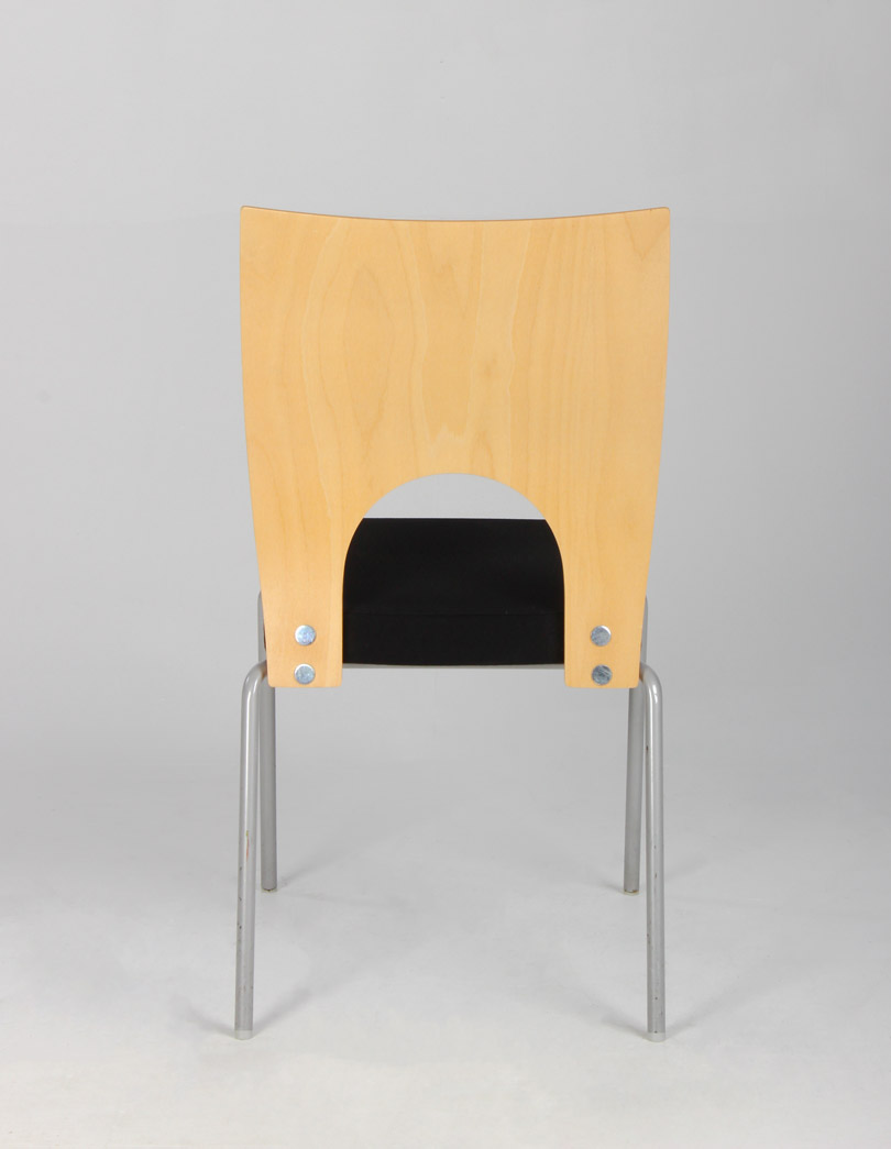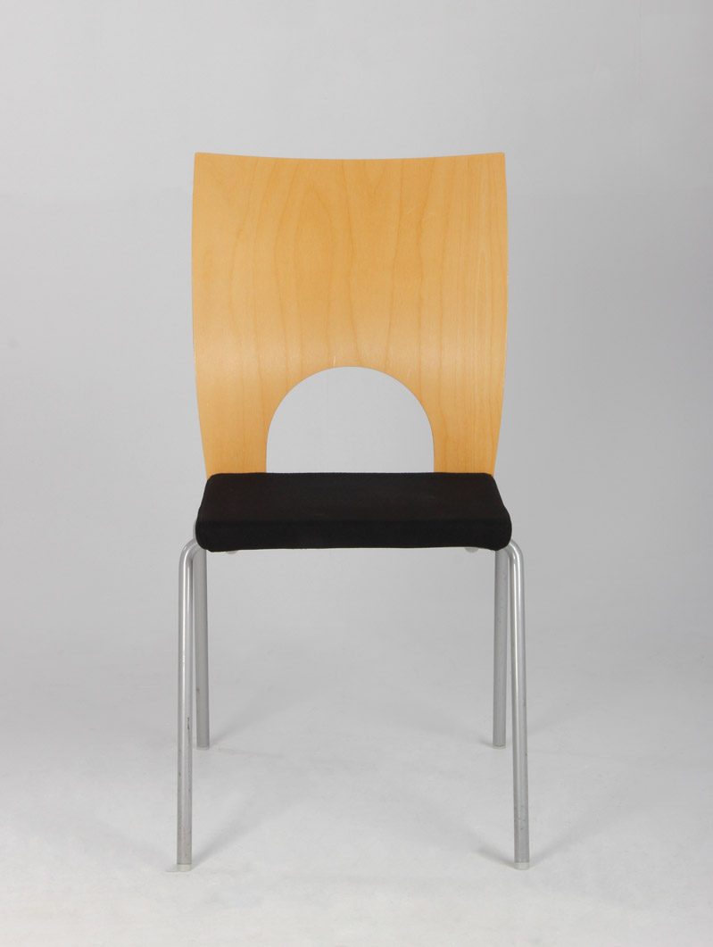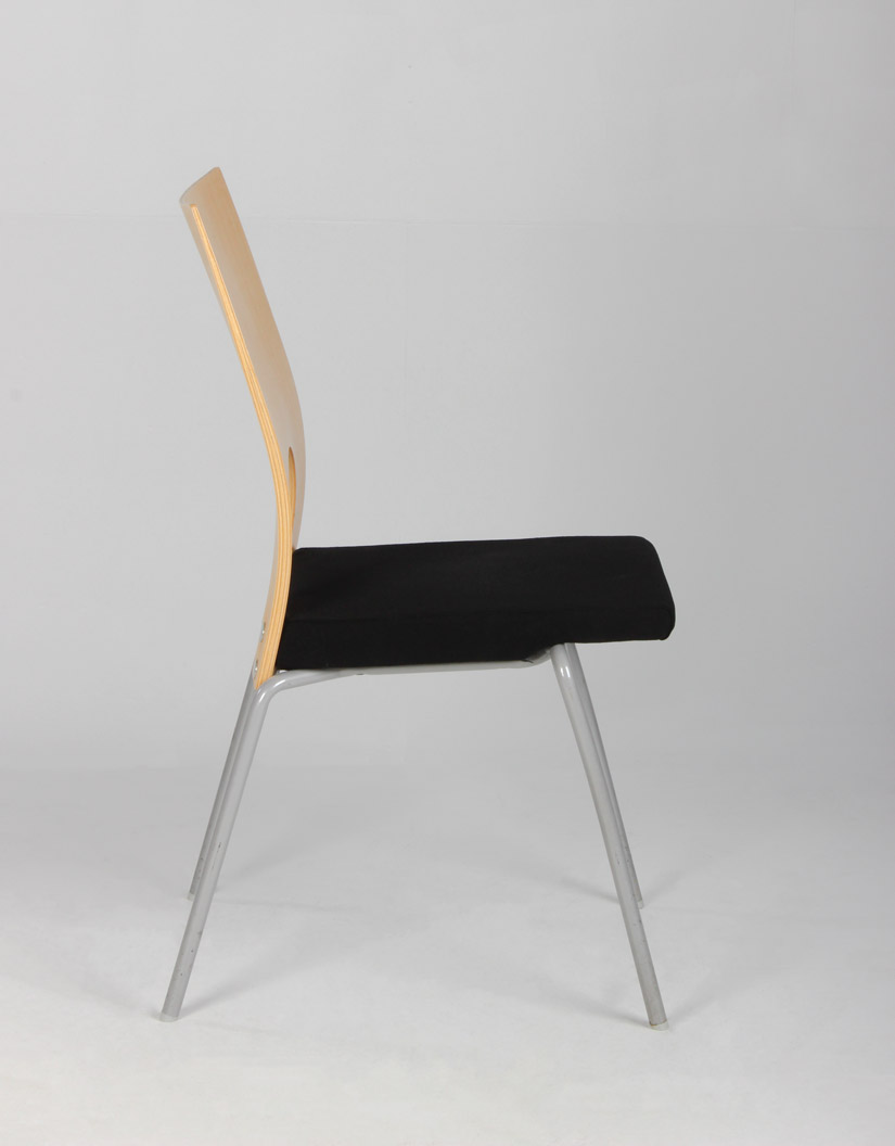 Kvalitetsstolen, produceret hos svenske Kinnarps, er stabelbar og har stel i mat grå stål.