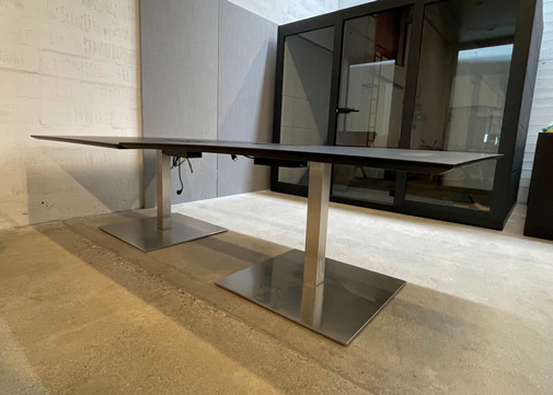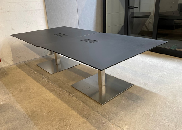 "Sort konferencebord på 2,8 meter i sort linoleum med sokler i børstet stål. To push-lemme med diverse strømforsyningsstik. Todelt bordplade, der holdes tæt og plant sammen ved hjælp af samlebeslag. Alt efter stolens bredde, er der plads til 4 stole på hver langside.