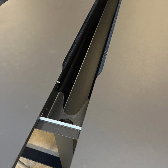 Den to-delte bordplade kan trækkes fra hinanden for adgang til kabelbakke hvor det er muligt at opbevare forlængerledninger og øvrig strømforsyning, så opladning af bl.a. laptops og mobiltelefoner, er lettilgængelig.