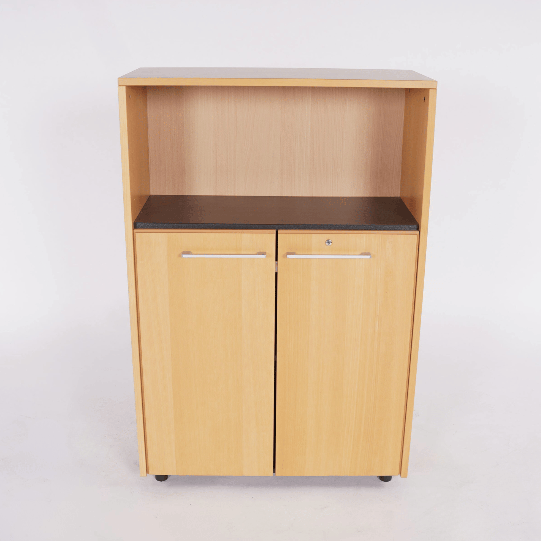 Kontorskab fremstillet i bøg med antracitgrå laminathylder. Låger i lakeret bøg med alugreb.