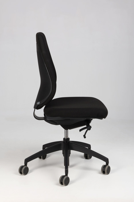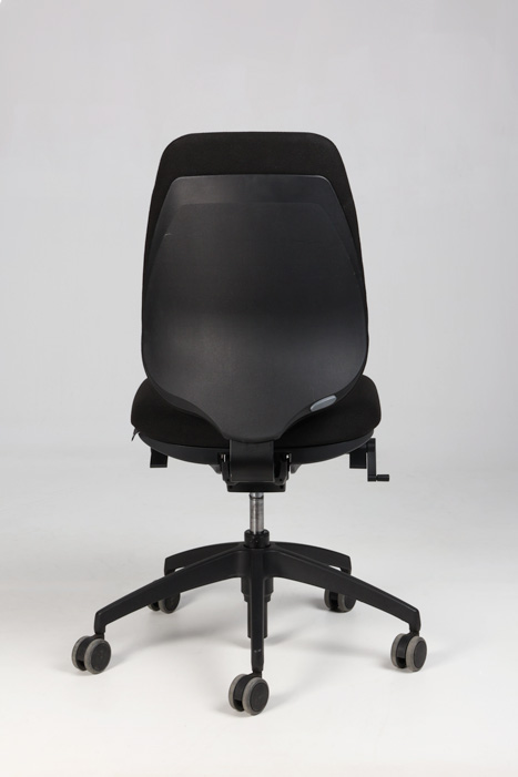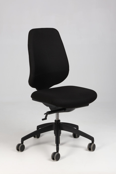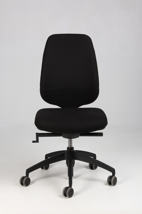 "Kontorstol polstret og betrukket med sort fame med sort fodkryds i standardhøjde. Foruden at kunne justeres i højden, er stolen udstyret med flere andre indstillingsmuligheder. Stellet er med gummihjul, der er velegnede til brug på alle underlag.