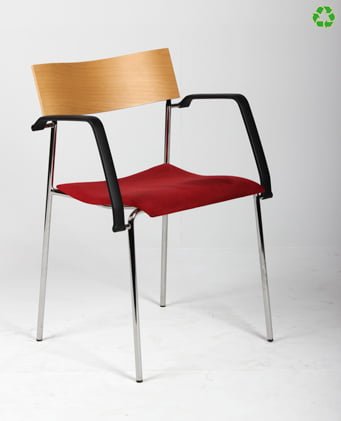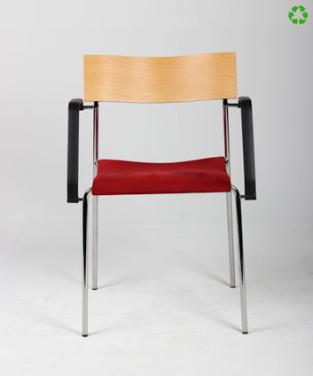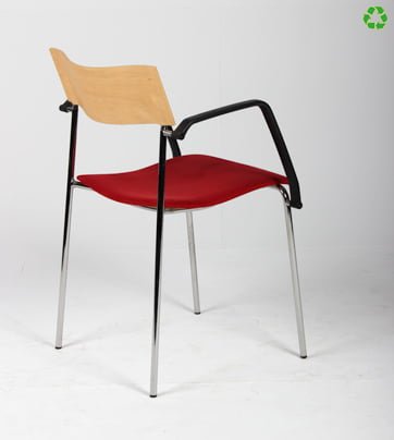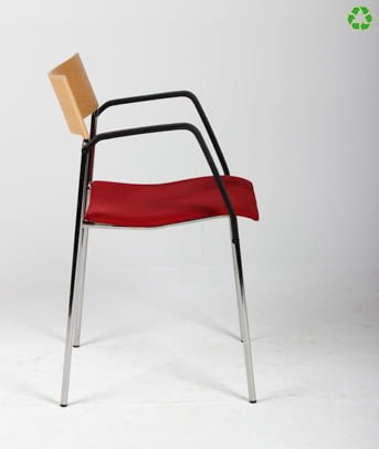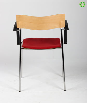 "Lammhults Campus stabelbar konference- og mødestol i rød med bøgefinéret rygstykke. Stolen har blankforkromet stel og sorte armlæn samt sæde betrukket med alcantara.