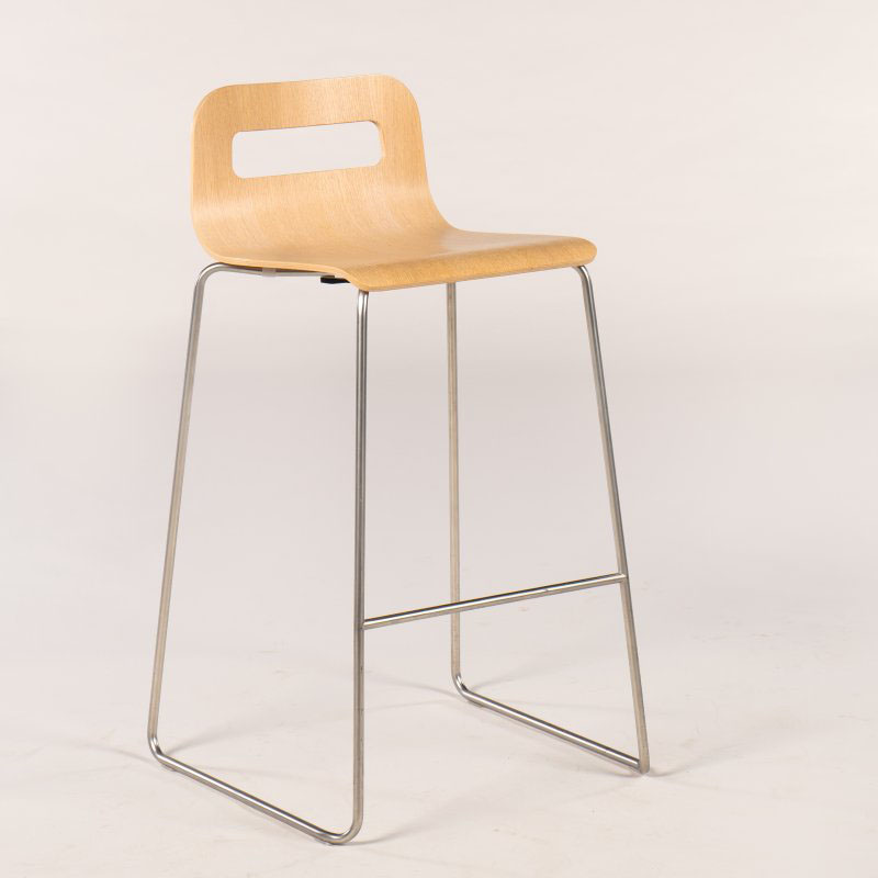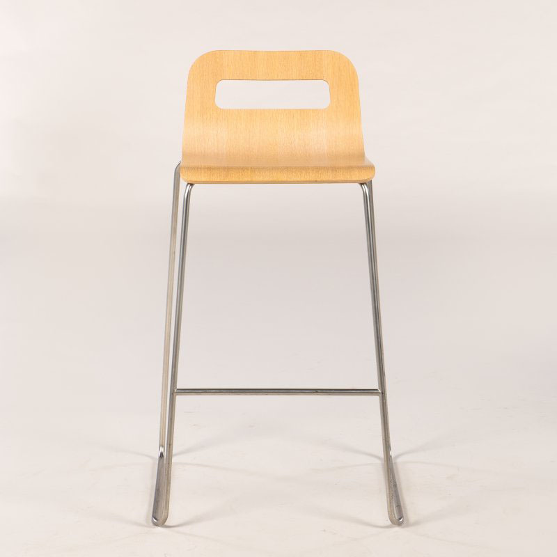 Lapalma HOLE barstol med formpresset sæde i lys lakeret eg. Den stabelbare stol har som navnet indikerer, et aflangt hul i det lille ryglæn, der er praktisk når den skal flyttes eller stables.