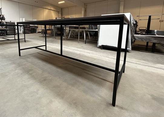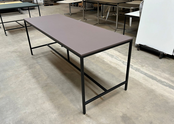 Langt højbord med linoleumsbordplade i en flot moccabrunlig nuance. Robust stel i sort jern, med en tværgående afstiver, der fungerer som fodhviler når man sidder ved bordet.