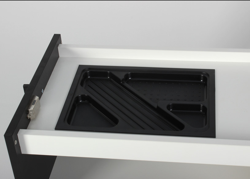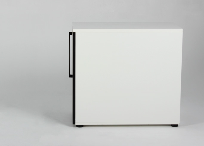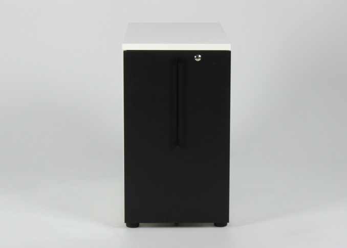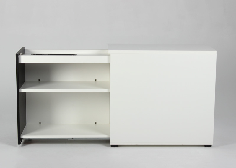 "Lavt venstrevendt udtræksskab i laminat med hvidt korpus og sort front. Den smarte opbevaringsløsning er, foruden at kunne rumme alt fra ringbind og øvrige kontorartikler, en anvendelig løsning til at adskille arbejdsstationer – eksempelvis i det åbne kontormiljø.