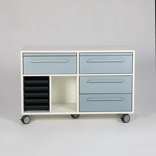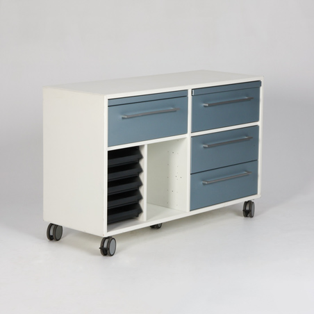 Lavt skuffemodul på hjul med korpus i hvid laminat og blåmetallic fronter.