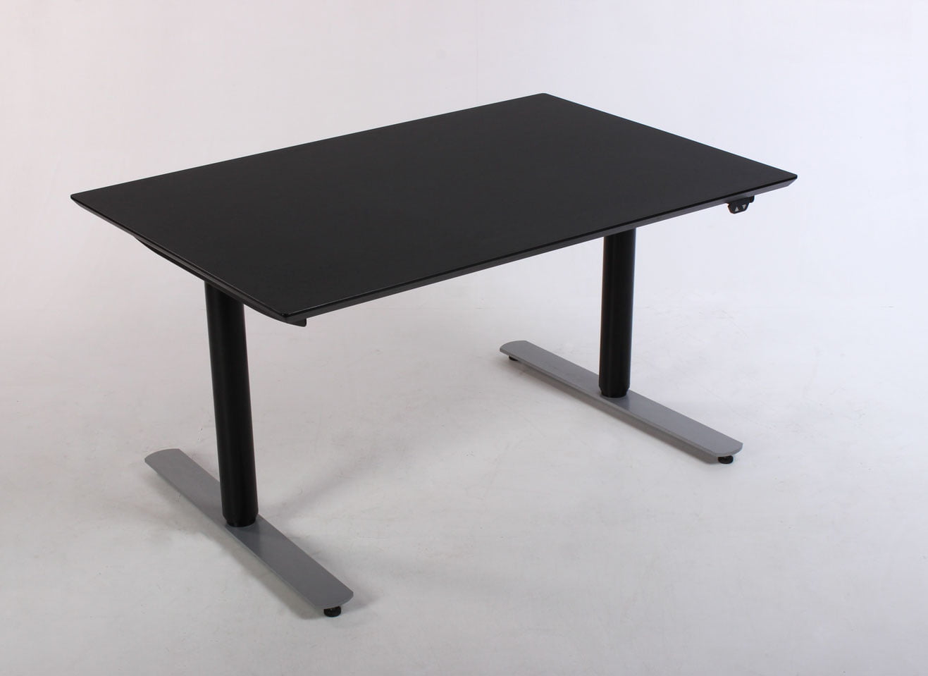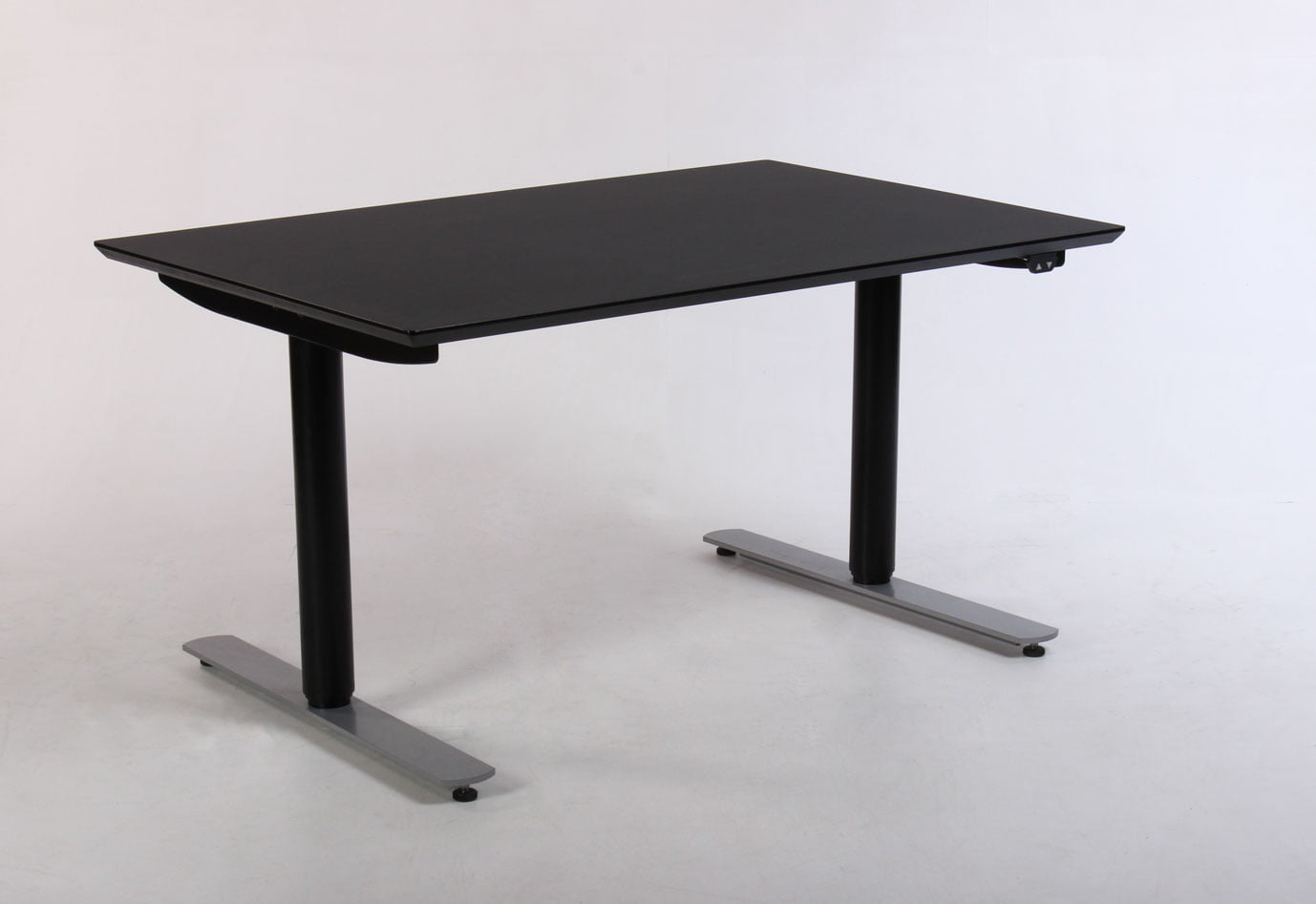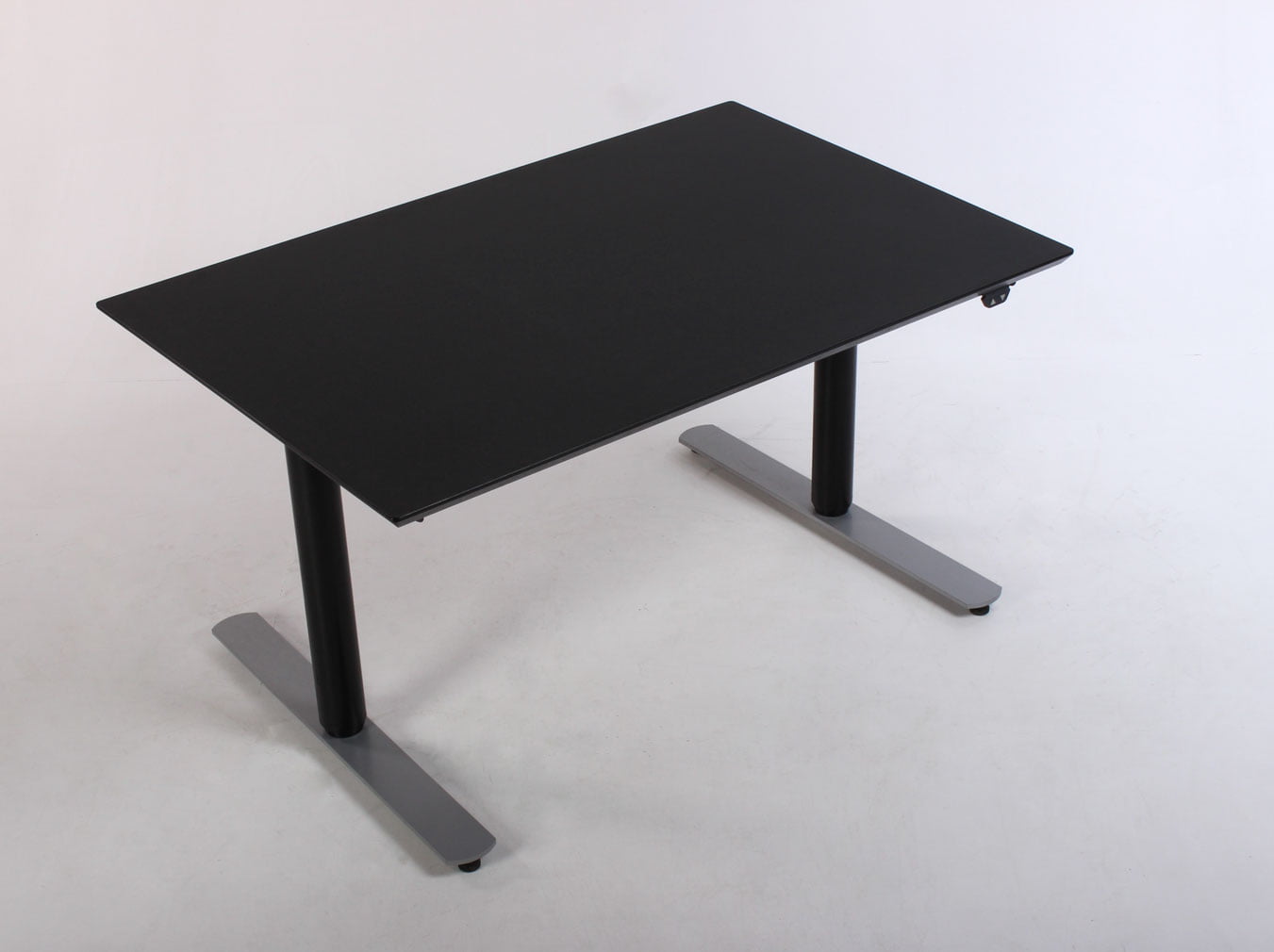 "Upcyclet Linak DL9 hæve-sænkebord med sort, fabriksny linoleumsbordplade med affasede kanter. Sort brugt stel med grå fødder der har to motorer og tre led, og giver mulighed for at justere højden fra 62-128 cm. For at skabe samling og orden på PC’ens kabler og det øvrige elektroniske udstyr, anbefales at tilkøbe en kabelbakke til montering under bordpladen.
