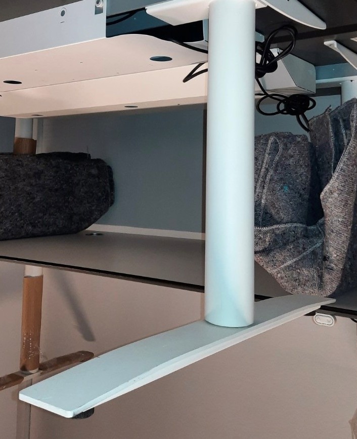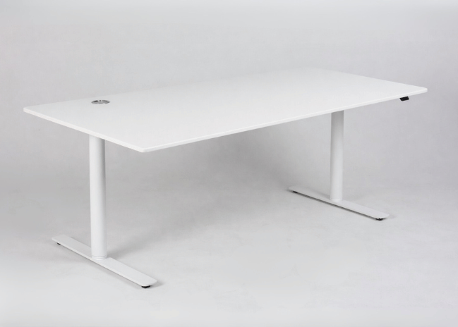 "Upcyclet hæve-sænkebord med fabriksny hvid laminatbordplade med afrundede kanter og hjørner. De bløde, afrundede kanter på bordpladen matcher de runde ben på det brugte LINAK-stel, og giver et let og moderne look.