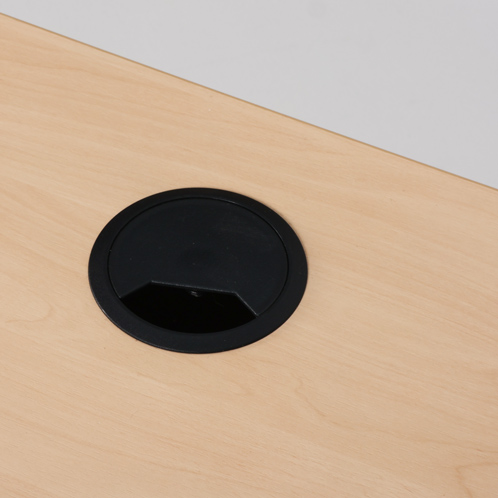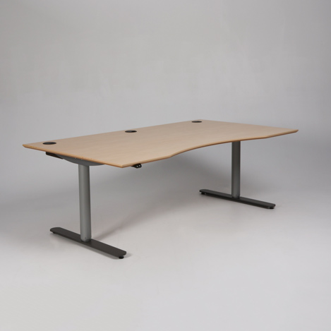 Linak hæve-sænkebord med lys birkelamineret bordplade med mavebue og tre kabelgennemføringer.