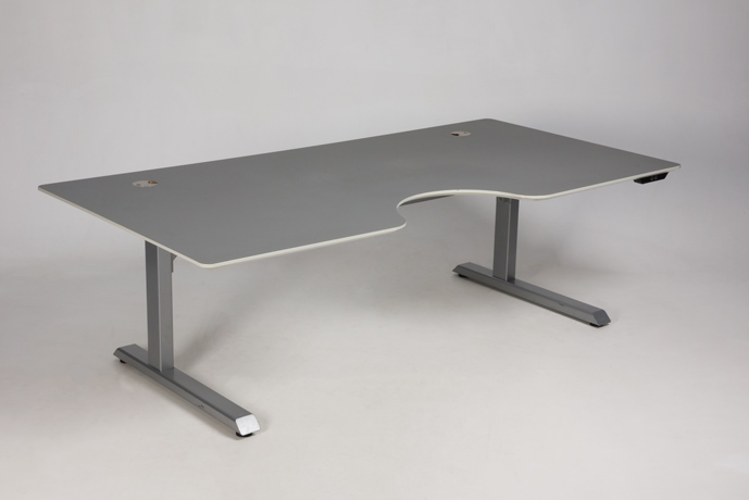 "Linak elektrisk hæve sænkebord med grå linoleumsbordplade med hvidmalet kant og mavebue. Gråt robust kvalitetsstel med to motorer samt kabelbakke til samling af ledninger under bordpladen.