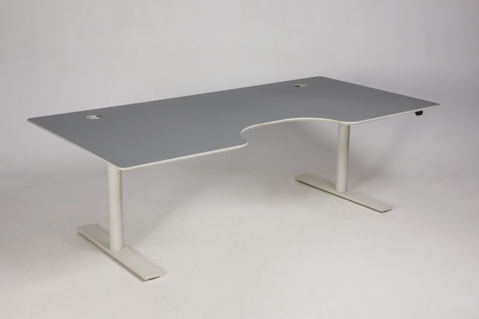 "Linak elektrisk hæve sænkebord med grå linoleumsbordplade med hvidmalet kant og mavebue. Hvidt, robust kvalitetsstel med to motorer samt kabelbakke til samling af ledninger under bordpladen.